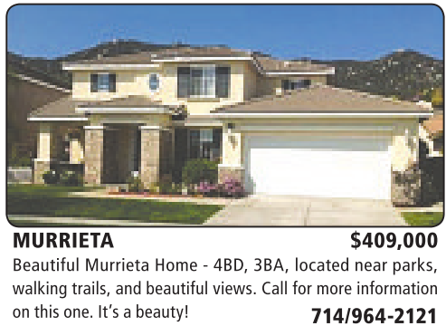 MURRIETA $409,000 Beautiful Murrieta Home - 4BD, 3BA, located near parks, walking trails, and beautiful views. Call for more information on this one.It’sabeauty! 714/964-2121