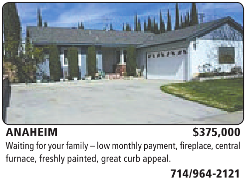 ANAHEIM $375,000 Waitingfor your family –low monthly payment, fireplace,central furnace, freshlypainted, great curb appeal.
