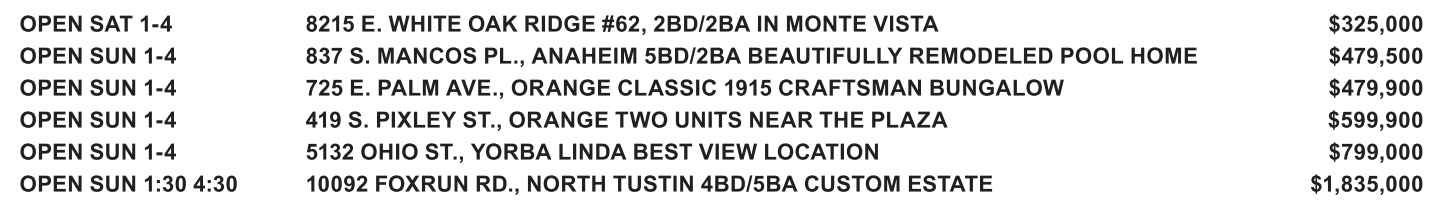 OPEN SAT 1-4 8215 E. WHITE OAK RIDGE #62, 2BD/2BA IN MONTE VISTA $325,000 OPEN SUN 1-4 837 S. MANCOS PL., ANAHEIM 5BD/2BA BEAUTIFULLY REMODELED POOL HOME $479,500 OPEN SUN 1-4 725 E. PALM AVE., ORANGE CLASSIC 1915 CRAFTSMAN BUNGALOW $479,900 OPEN SUN 1-4 419 S. PIXLEY ST., ORANGE TWO UNITS NEAR THE PLAZA $599,900 OPEN SUN 1-4 5132 OHIO ST., YORBA LINDA BEST VIEW LOCATION $799,000 OPEN SUN 1:30 4:30 10092 FOXRUN RD., NORTH TUSTIN 4BD/5BA CUSTOM ESTATE $1,835,000
