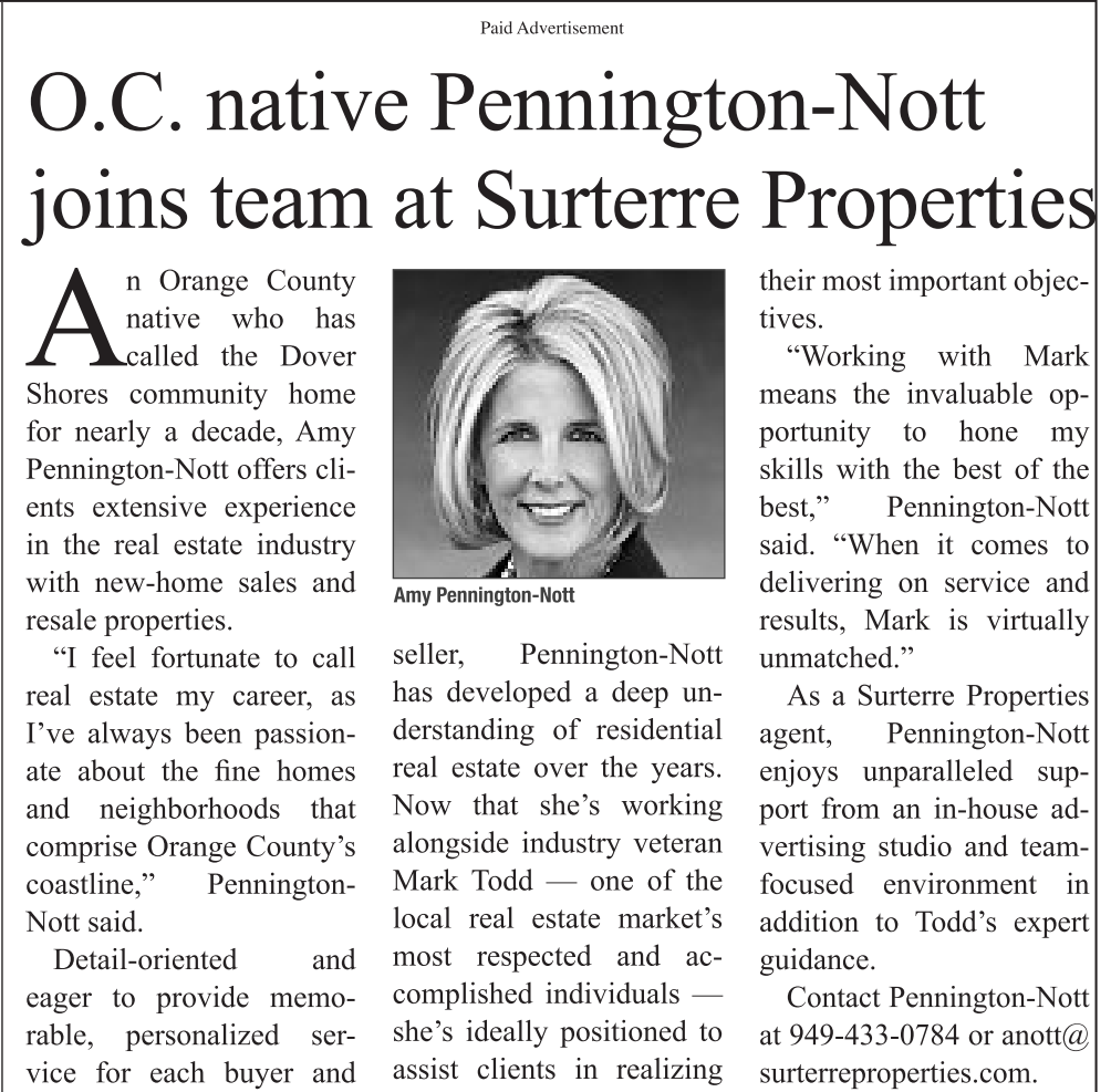 An Orange County native who has called the Dover Shores community home for nearly a decade, Amy Pennington-Nott offers clients extensive experience in the real estate industry with new-home sales and resale properties. “I feel fortunate to call real estate my career, as I’ve always been passionate about the fine homes and neighborhoods that comprise Orange County’s coastline,” Pennington- Nott said. Detail-oriented and eager to provide memorable, personalized service for each buyer and Paid Advertisement O.C. native Pennington-Nott joins team at Surterre Properties Amy Pennington-Nott seller, Pennington-Nott has developed a deep understanding of residential real estate over the years. Now that she’s working alongside industry veteran Mark Todd — one of the local real estate market’s most respected and accomplished individuals — she’s ideally positioned to assist clients in realizing their most important objectives. “Working with Mark means the invaluable opportunity to hone my skills with the best of the best,” Pennington-Nott said. “When it comes to delivering on service and results, Mark is virtually unmatched.” As a Surterre Properties agent, Pennington-Nott enjoys unparalleled support from an in-house advertising studio and teamfocused environment in addition to Todd’s expert guidance. Contact Pennington-Nott at 949-433-0784 or anott@ surterreproperties.com.