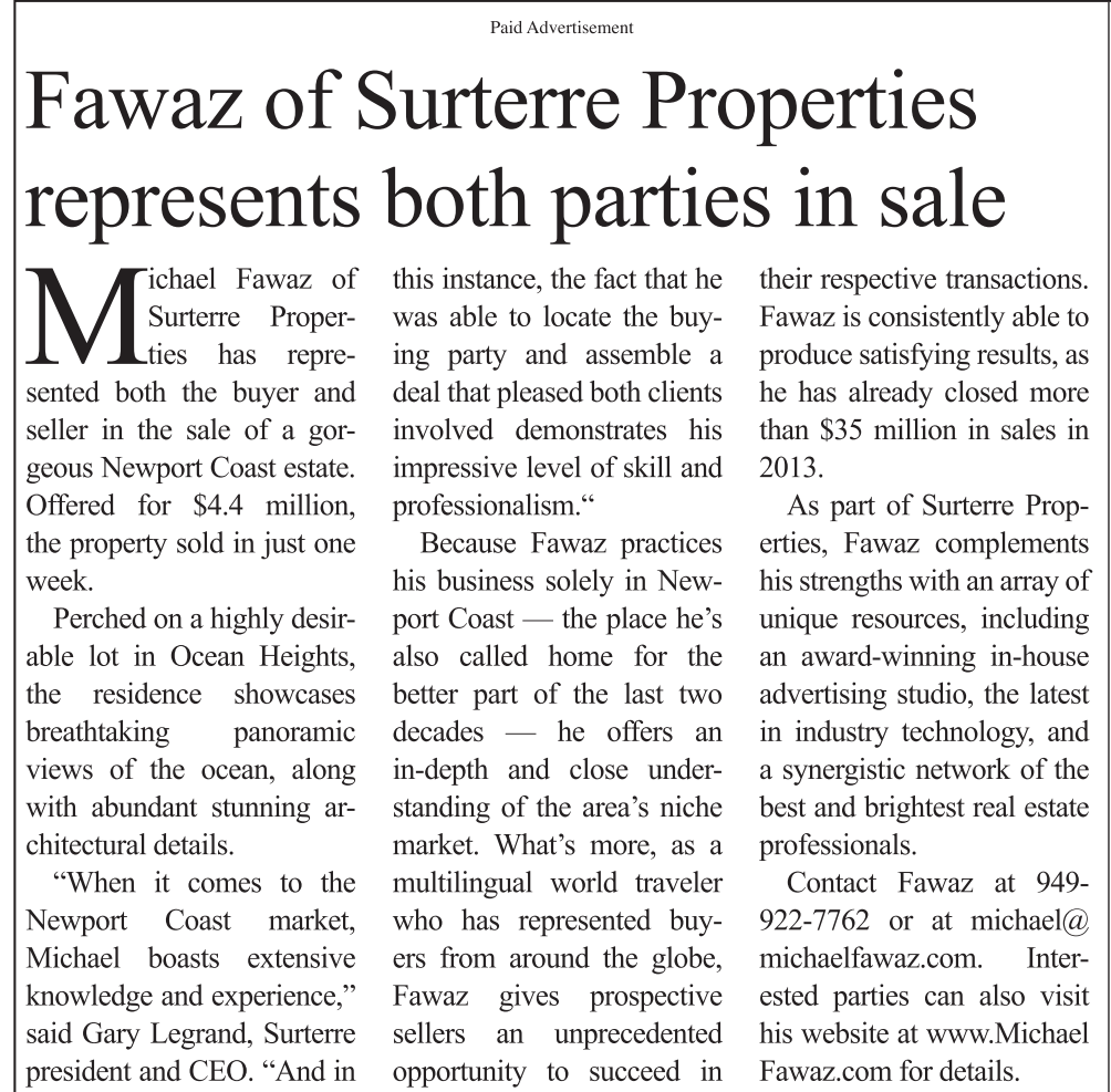 Michael Fawaz of Surterre Properties has represented both the buyer and seller in the sale of a gorgeous Newport Coast estate. Offered for $4.4 million, the property sold in just one week. Perched on a highly desirable lot in Ocean Heights, the residence showcases breathtaking panoramic views of the ocean, along with abundant stunning architectural details. “When it comes to the Newport Coast market, Michael boasts extensive knowledge and experience,” said Gary Legrand, Surterre president and CEO. “And in Paid Advertisement this instance, the fact that he was able to locate the buying party and assemble adeal that pleased both clients involved demonstrates his impressive level of skill and professionalism.“ Because Fawaz practices his business solely in Newport Coast — the place he’s also called home for the better part of the last two decades — he offers an in-depth and close understanding of the area’s niche market. What’s more, as amultilingual world traveler who has represented buyers from around the globe, Fawaz gives prospective sellers an unprecedented opportunity to succeed in Fawaz of Surterre Properties represents both parties in sale their respective transactions. Fawaz is consistently able to produce satisfying results, as he has already closed more than $35 million in sales in 2013. As part of Surterre Properties, Fawaz complements his strengths with an array of unique resources, including an award-winning in-house advertising studio, the latest in industry technology, and a synergistic network of the best and brightest real estate professionals. Contact Fawaz at 949- 922-7762 or at michael@ michaelfawaz.com. Interested parties can also visit his website at www.Michael Fawaz.com for details.