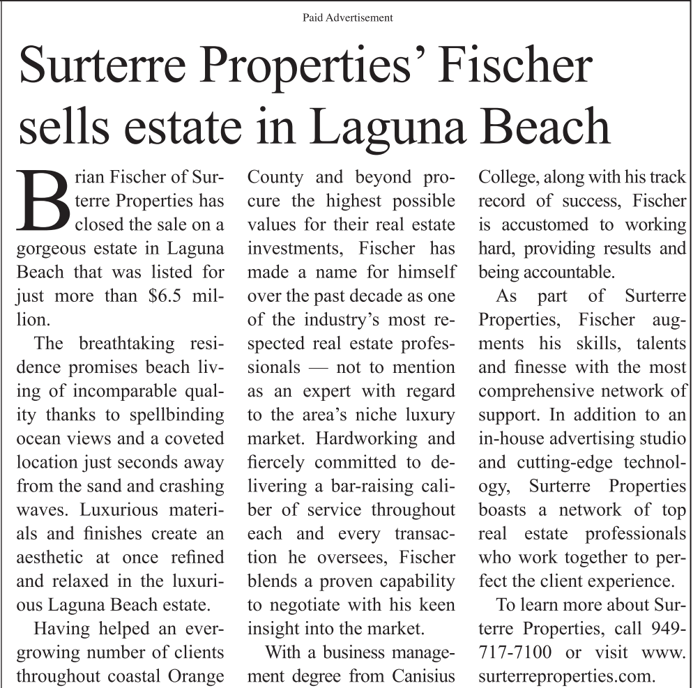 Brian Fischer of Surterre Properties has closed the sale on agorgeous estate in Laguna Beach that was listed for just more than $6.5 million. The breathtaking residence promises beach living of incomparable quality thanks to spellbinding ocean views and a coveted location just seconds away from the sand and crashing waves. Luxurious materials and finishes create an aesthetic at once refined and relaxed in the luxurious Laguna Beach estate. Having helped an evergrowing number of clients throughout coastal Orange Paid Advertisement Surterre Properties’ Fischer sells estate in Laguna Beach County and beyond procure the highest possible values for their real estate investments, Fischer has made a name for himself over the past decade as one of the industry’s most respected real estate professionals — not to mention as an expert with regard to the area’s niche luxury market. Hardworking and fiercely committed to delivering a bar-raising caliber of service throughout each and every transaction he oversees, Fischer blends a proven capability to negotiate with his keen insight into the market. With a business management degree from Canisius College, along with his track record of success, Fischer is accustomed to working hard, providing results and being accountable. As part of Surterre Properties, Fischer augments his skills, talents and finesse with the most comprehensive network of support. In addition to an in-house advertising studio and cutting-edge technology, Surterre Properties boasts a network of top real estate professionals who work together to perfect the client experience. To learn more about Surterre Properties, call 949- 717-7100 or visit www. surterreproperties.com.