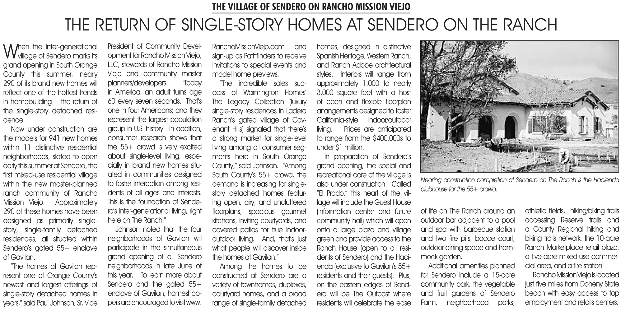 the inter-generational village of Sendero marks its grand opening in South Orange County this summer, nearly 290 of its brand new homes will reflect one of the hottest trends in homebuilding -- the return of the single-story detached residence.