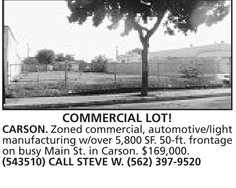 CARSON. Zonedcommercial, automotive/light manufacturingw/over 5,800 SF.50-ft. frontage on busy Main St. in Carson. $169,000. (543510) CALL STEVE W. (562) 397-9520