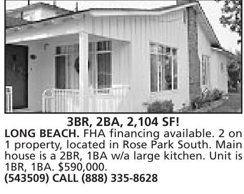 LONG BEACH. FHA financing available. 2 on 1 property, located in Rose Park South. Main house is a 2BR, 1BA w/a large kitchen. Unit is 1BR, 1BA. $590,000. (543509) CALL (888) 335-8628