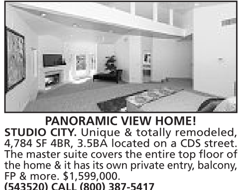 PANORAMIC VIEW HOME! STUDIO CITY. Unique & totally remodeled, 4,784 SF 4BR, 3.5BA located on a CDS street. The master suite covers the entire top floor of the home &ithas its own private entry,balcony, FP & more. $1,599,000. (543520) CALL (800) 387-5417