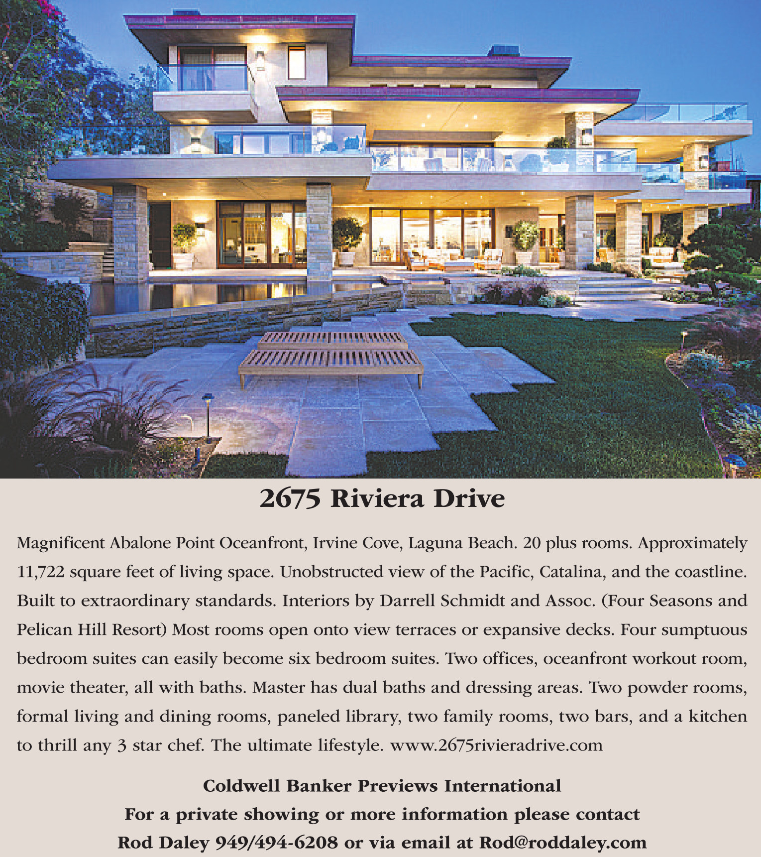 2675 Riviera Drive Magnificent Abalone Point Oceanfront, Irvine Cove, Laguna Beach. 20 plus rooms. Approximately 11,722 square feet of living space. Unobstructed view of the Pacific, Catalina, and the coastline. Built to extraordinary standards. Interiors by Darrell Schmidt and Assoc. (Four Seasons and Pelican Hill Resort) Most rooms open onto view terraces or expansive decks. Four sumptuous bedroom suites can easily become six bedroom suites. Two offices, oceanfront workout room, movie theater, all with baths. Master has dual baths and dressing areas. Two powder rooms, formal living and dining rooms, paneled library, two family rooms, two bars, and a kitchen to thrill any 3 star chef. The ultimate lifestyle. www.2675rivieradrive.com Coldwell Banker Previews International For a private showing or more information please contact Rod Daley 949/494-6208 or via email at Rod@roddaley.com