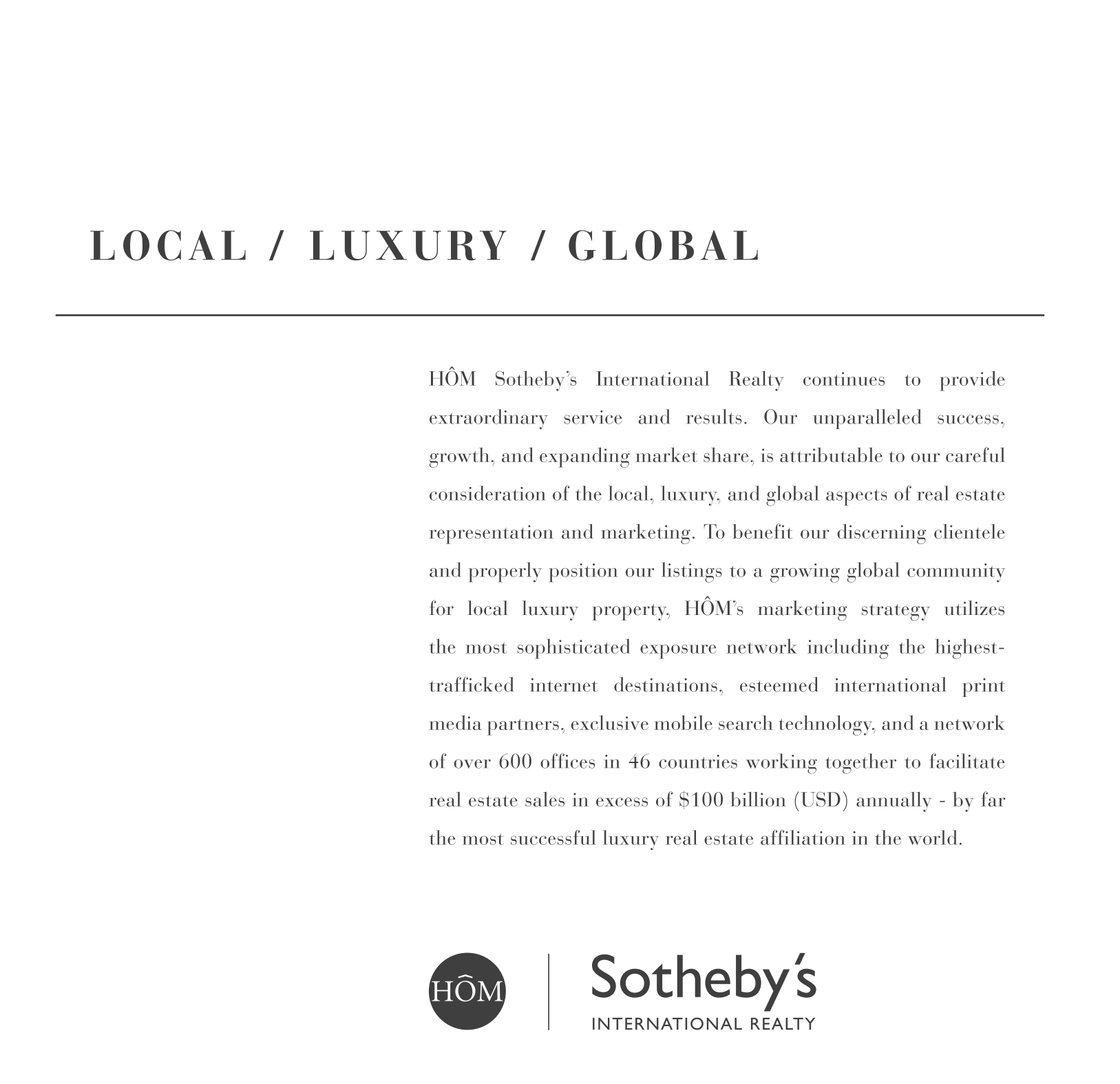 HÔM Sotheby’s International Realty continues to provide extraordinary service and results. Our unparalleled success, growth, and expanding market share, is attributable to our careful consideration of the local, luxury, and global aspects of real estate representation and marketing. To benefit our discerning clientele and properly position our listings to a growing global community for local luxury property, HÔM’s marketing strategy utilizes the most sophisticated exposure network including the highesttrafficked internet destinations, esteemed international print media partners, exclusive mobile search technology, and a network of over 600 offices in 46 countries working together to facilitate real estate sales in excess of $100 billion (USD) annually - by far the most successful luxury real estate affiliation in the world.