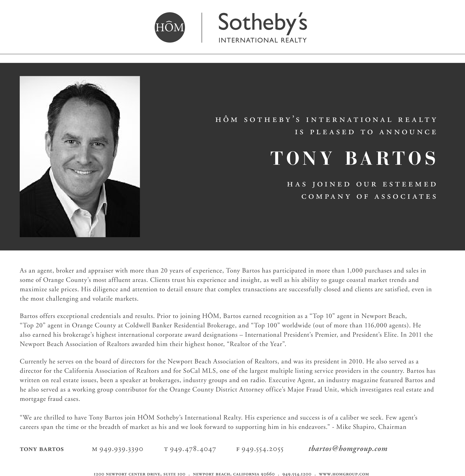 “We are thrilled to have Tony Bartos join HÔM Sotheby’s International Realty. His experience and success is of a caliber we seek. Few agent’s careers span the time or the breadth of market as his and we look forward to supporting him in his endeavors.” - Mike Shapiro, Chairman