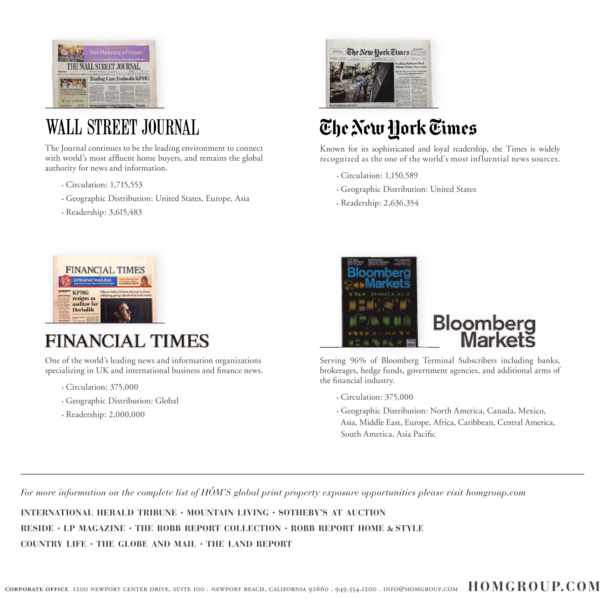 For more information on the complete list of HÔM’S global print property exposure opportunities please visit homgroup.com international herald tribune • mountain living • sotheby’s at auction reside • lp magazine • the robb report collection • robb report home & style country life • the globe and mail • the land report