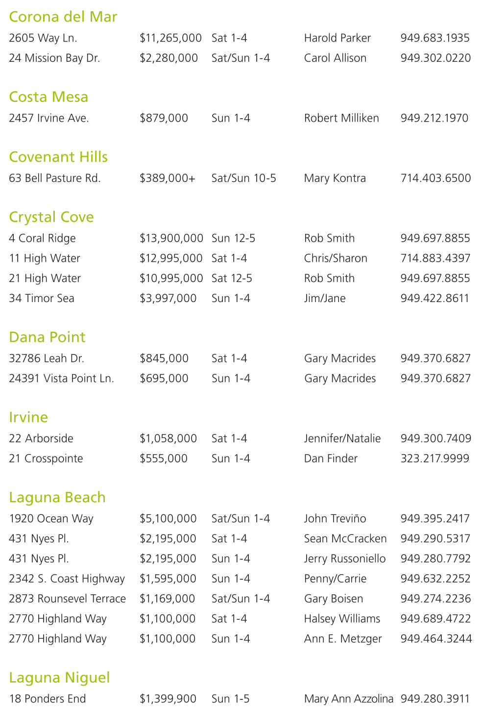 4 Coral Ridge $13,900,000 Sun 12-5 Rob Smith 949.697.8855 11 High Water $12,995,000 Sat 1-4 Chris/Sharon 714.883.4397 21 High Water $10,995,000 Sat 12-5 Rob Smith 949.697.8855 34 Timor Sea $3,997,000 Sun 1-4 Jim/Jane 949.422.8611