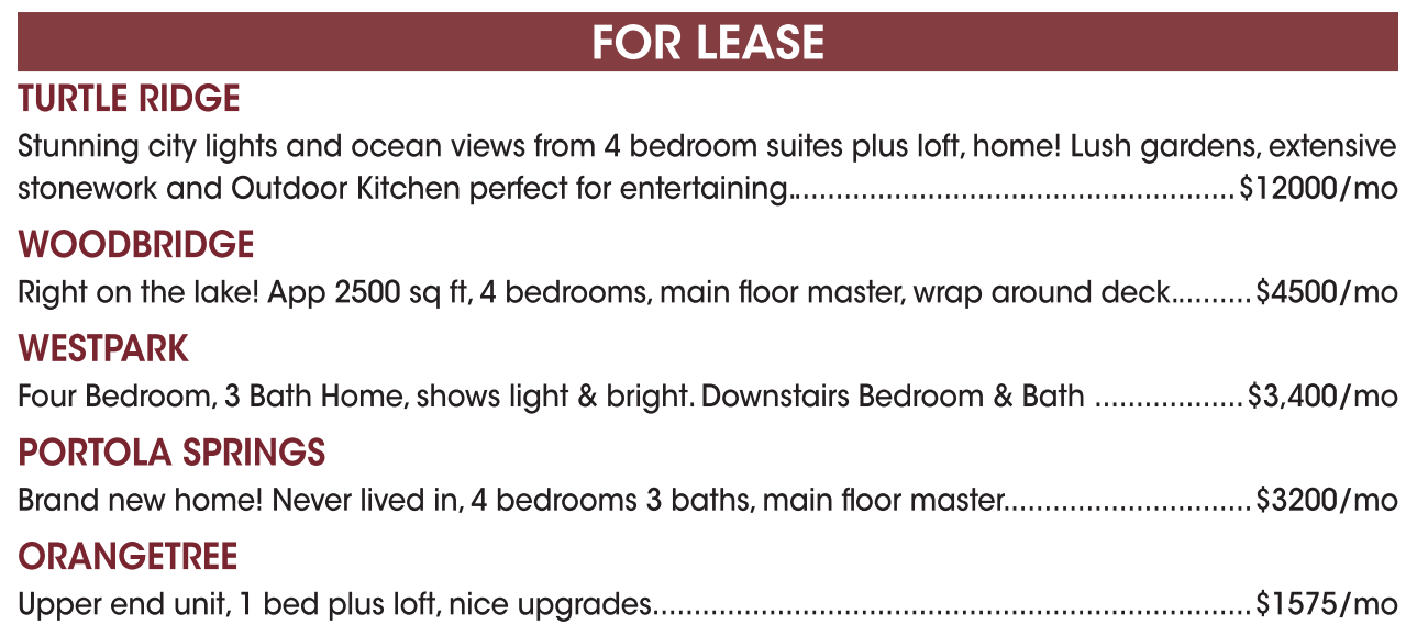FOR LEASE TURTLE RIDGE Stunning city lights and ocean views from 4 bedroom suites plus loft, home! Lush gardens,extensive stonework and Outdoor Kitchen perfect for entertaining......................................................$12000/mo WOODBRIDGE Right on the lake! App 2500 sq ft, 4 bedrooms,main floor master,wrap around deck..........$4500/mo WESTPARK Four Bedroom, 3 Bath Home,shows light & bright. Downstairs Bedroom & Bath ..................$3,400/mo PORTOLA SPRINGS Brand new home! Never lived in, 4 bedrooms 3 baths,main floor master..............................$3200/mo ORANGETREE Upper end unit, 1 bed plus loft, nice upgrades........................................................................$1575/mo