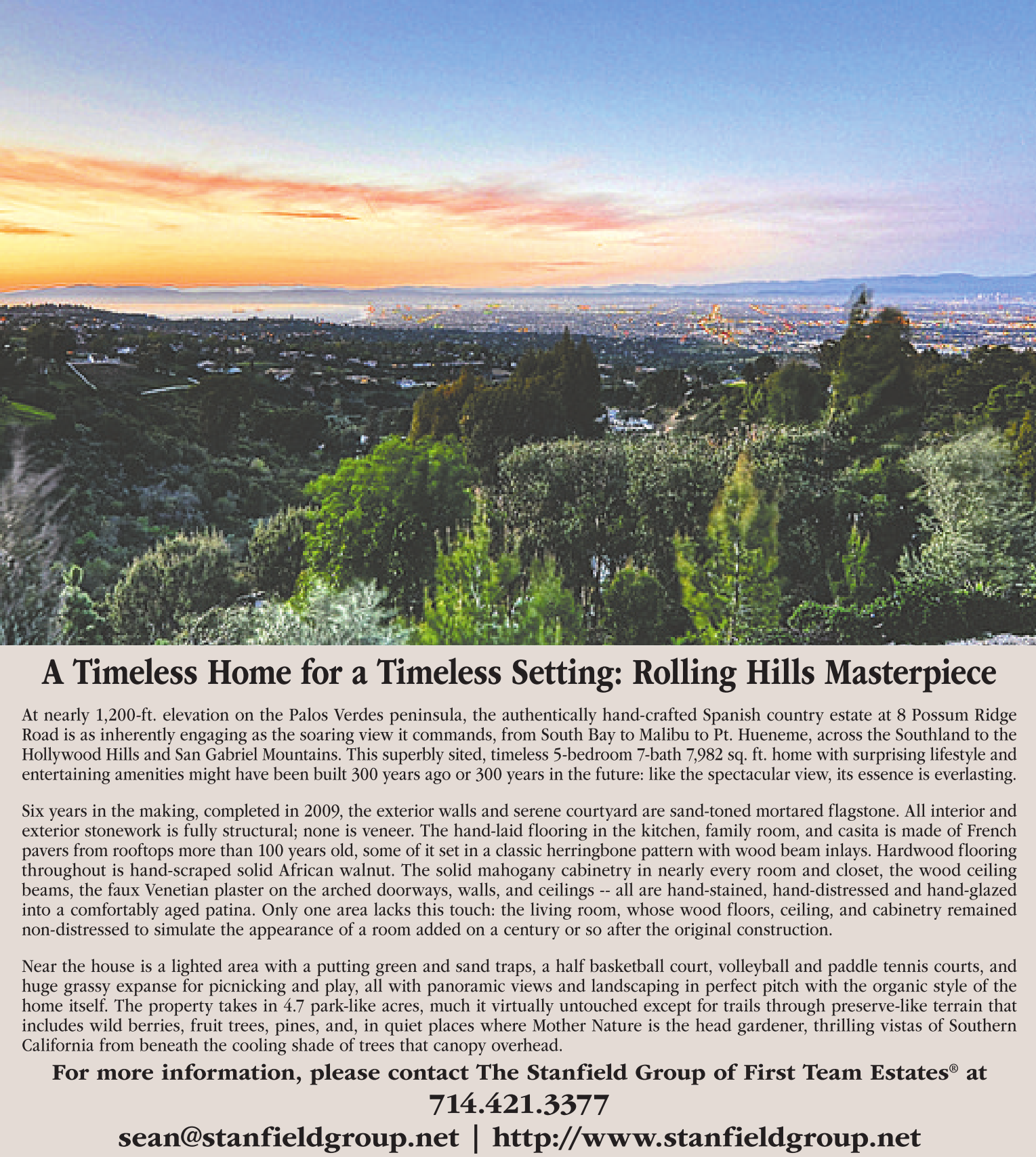 At nearly 1,200-ft. elevation on the Palos Verdes peninsula, the authentically hand-crafted Spanish country estate at 8 Possum Ridge
