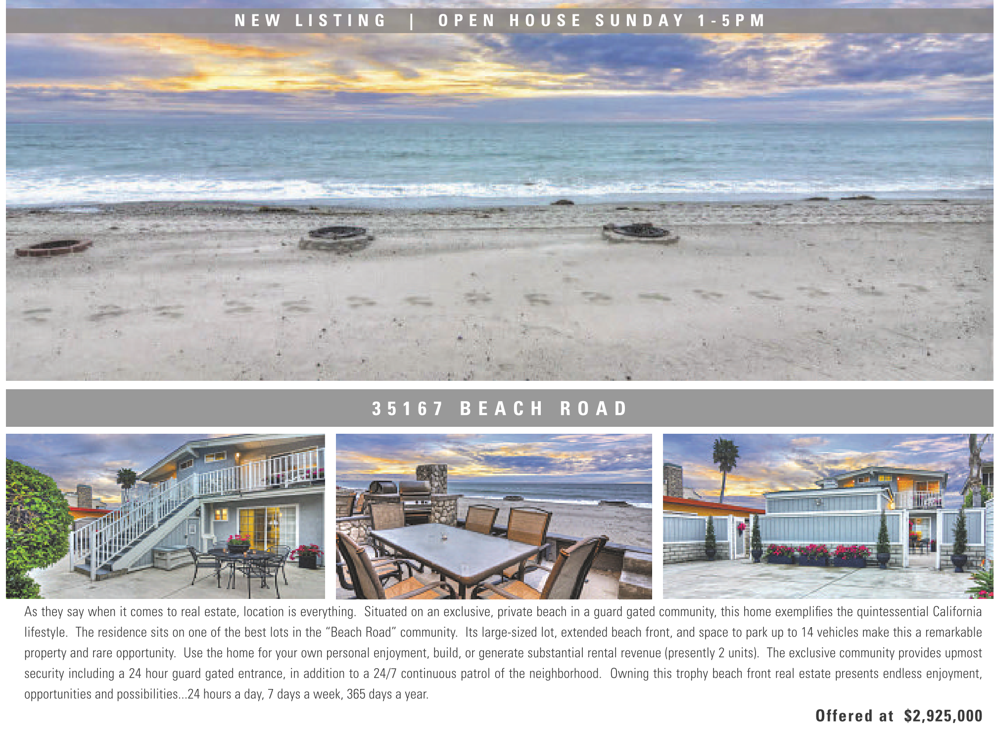 As they say when it comes to real estate, location is everything. Situated on an exclusive, private beach in a guard gated community, this home exemplifies the quintessential California lifestyle. The residence sits on one of the best lots in the “Beach Road” community. Its large-sized lot, extended beach front, and space to park up to 14 vehicles make this a remarkable property and rare opportunity. Use the home for your own personal enjoyment, build, or generate substantial rental revenue (presently 2 units). The exclusive community provides upmost security including a 24 hour guard gated entrance, in addition to a 24/7 continuous patrol of the neighborhood. Owning this trophy beach front real estate presents endless enjoyment, opportunities and possibilities...24 hours a day, 7 days a week, 365 days a year.