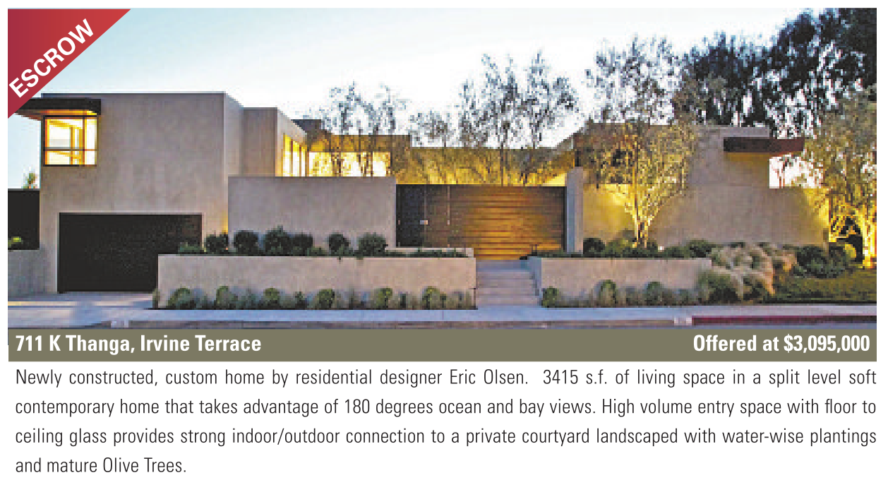 711 K Thanga, Irvine Terrace Offered at $3,095,000 Newly constructed, custom home by residential designer Eric Olsen. 3415 s.f. of living space in a split level soft contemporary home that takes advantage of 180 degrees ocean and bay views. High volume entry space with floor to ceiling glass provides strong indoor/outdoor connection to a private courtyard landscaped with water-wise plantings and mature Olive Trees.