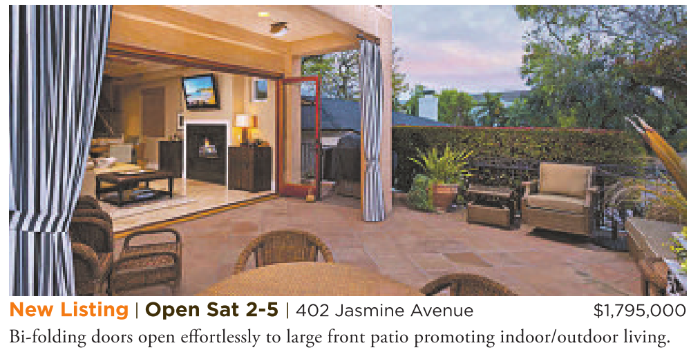 New Listing | Open Sat 2-5 | 402 Jasmine Avenue $1,795,000 Bi-folding doors open effortlessly to large front patio promoting indoor/outdoor living.