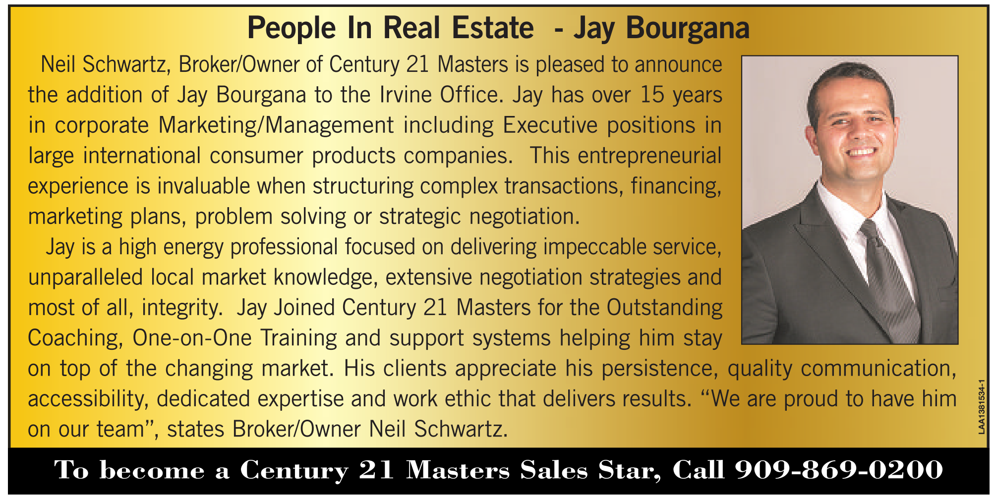 People In Real Estate - Jay Bourgana Neil Schwartz, Broker/Owner of Century 21 Masters is pleased to announce the addition of Jay Bourgana to the Irvine Office. Jay has over 15 years in corporate Marketing/Management including Executive positions in large international consumer products companies. This entrepreneurial experience is invaluable when structuring complex transactions, financing, marketing plans, problem solving or strategic negotiation. Jay is a high energy professional focused on delivering impeccable service, unparalleled local market knowledge, extensive negotiation strategies and most of all, integrity. Jay Joined Century 21 Masters for the Outstanding Coaching, One-on-One Training and support systems helping him stay on top of the changing market. His clients appreciate his persistence, quality communication, accessibility, dedicated expertise and work ethic that delivers results. “We are proud to have him on our team”, states Broker/Owner Neil Schwartz. To become a Century 21 Masters Sales Star, Call 909-869-0200