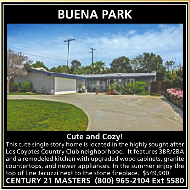 This cute single storyhomeislocatedinthe highly sought after LosCoyotes Country Club neighborhood. Itfeatures3BR/2BA andaremodeledkitchen withupgradedwoodcabinets,granite countertops, and newer appliances. In the summer enjoy the top ofline Jacuzzi next tothe stone fireplace. $549,900 CENTURY 21 MASTERS (800) 965-2104 Ext 5580