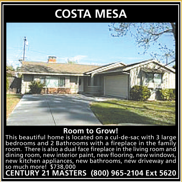 This beautiful home is located on a cul-de-sac with 3 large bedrooms and 2 Bathrooms with a fireplace in the family room. Thereisalso adualfacefireplaceinthe living room and diningroom, newinteriorpaint, newflooring, newwindows, new kitchen appliances, new bathrooms, new driveway and so much more! $738,000 CENTURY 21 MASTERS (800) 965-2104 Ext 5620