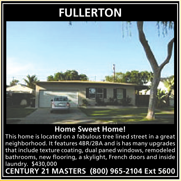 This home is located onafabulous tree lined street in agreat neighborhood. Itfeatures 4BR/2BA and ishas many upgrades thatinclude texturecoating, dualpaned windows,remodeled bathrooms, new flooring, a skylight, French doors and inside laundry. $430,000 CENTURY 21 MASTERS (800) 965-2104 Ext 5600