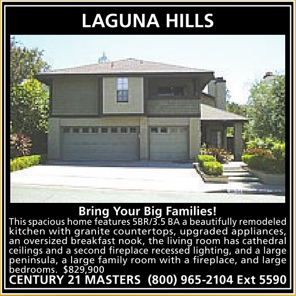 This spacious home features 5BR/3.5 BA abeautifully remodeled kitchen with granite countertops, upgraded appliances, an oversized breakfast nook, the living room has cathedral ceilings and a second fireplace recessed lighting, and a large peninsula, a large family room with a fireplace, and large bedrooms. $829,900 CENTURY 21 MASTERS (800) 965-2104 Ext 5590