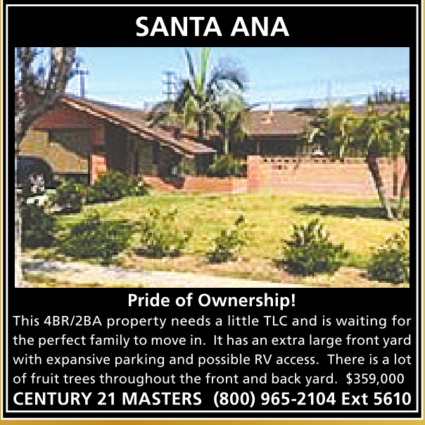 This 4BR/2BA property needs a little TLC and is waiting for the perfect family to move in. Ithas an extra large front yard with expansive parking and possible RV access. There is alot of fruit trees throughout the front and back yard. $359,000 CENTURY 21 MASTERS (800) 965-2104 Ext 5610