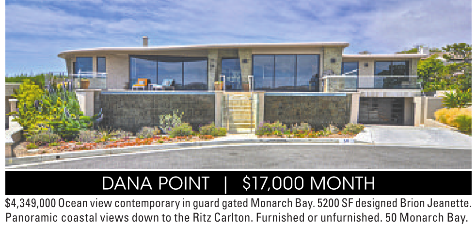 $4,349,000 Oceanviewcontemporaryinguard gatedMonarch Bay. 5200 SF designedBrion Jeanette. Panoramiccoastal viewsdowntothe Ritz Carlton. Furnishedorunfurnished. 50 MonarchBay.