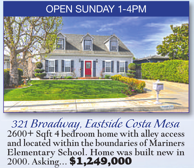OPEN SUNDAY 1-4PM 321 Broadway, Eastside Costa Mesa 321 Broadway, Eastside Costa Mesa 2600+ Sqft 4 bedroom home with alley access and located within the boundaries of Mariners Elementary School. Home was built new in 2000. Asking... $1,249,000 See also