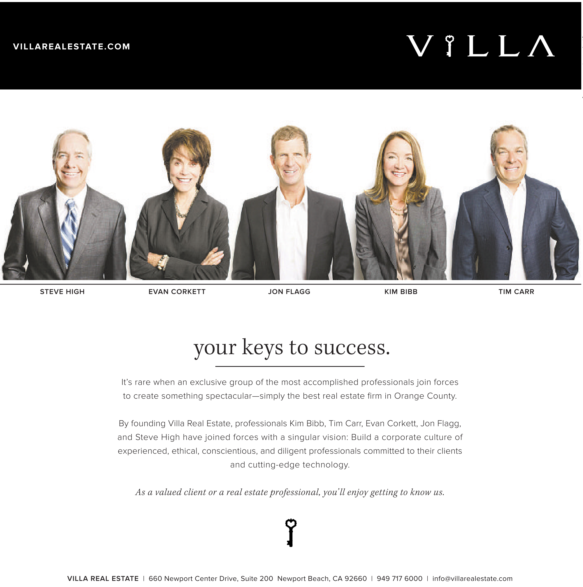 By founding Villa Real Estate, professionals Kim Bibb, Tim Carr, Evan Corkett, Jon Flagg, and Steve High have joined forces with a singular vision: Build a corporate culture of experienced, ethical, conscientious, and diligent professionals committed to their clients and cutting-edge technology.