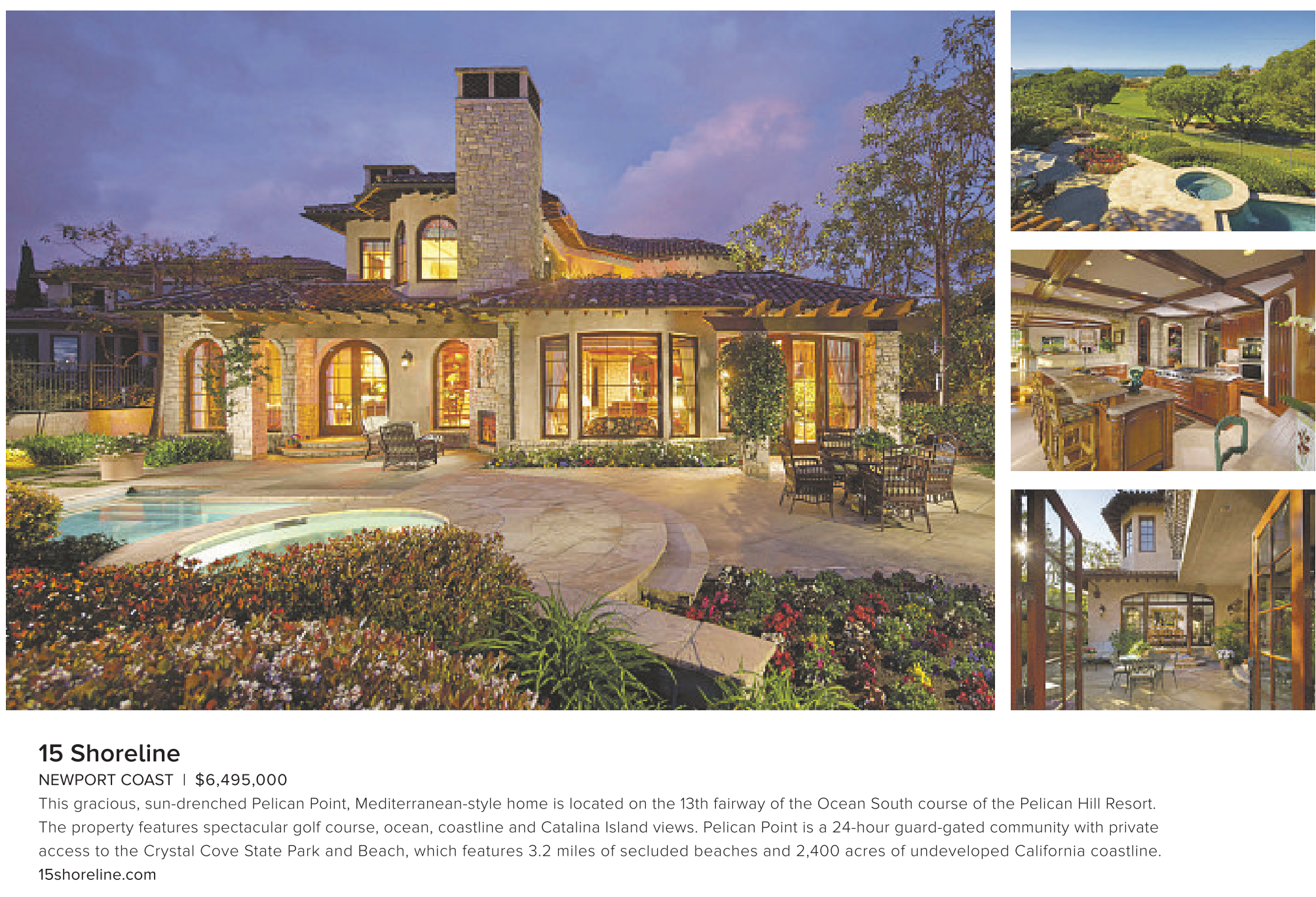 NEWPORT COAST | $6,495,000 This gracious, sun-drenched Pelican Point, Mediterranean-style home is located on the 13th fairway of the Ocean South course of the Pelican Hill Resort. The property features spectacular golf course, ocean, coastline and Catalina Island views. Pelican Point is a 24-hour guard-gated community with private access to the Crystal Cove State Park and Beach, which features 3.2 miles of secluded beaches and 2,400 acres of undeveloped California coastline. 15shoreline.com