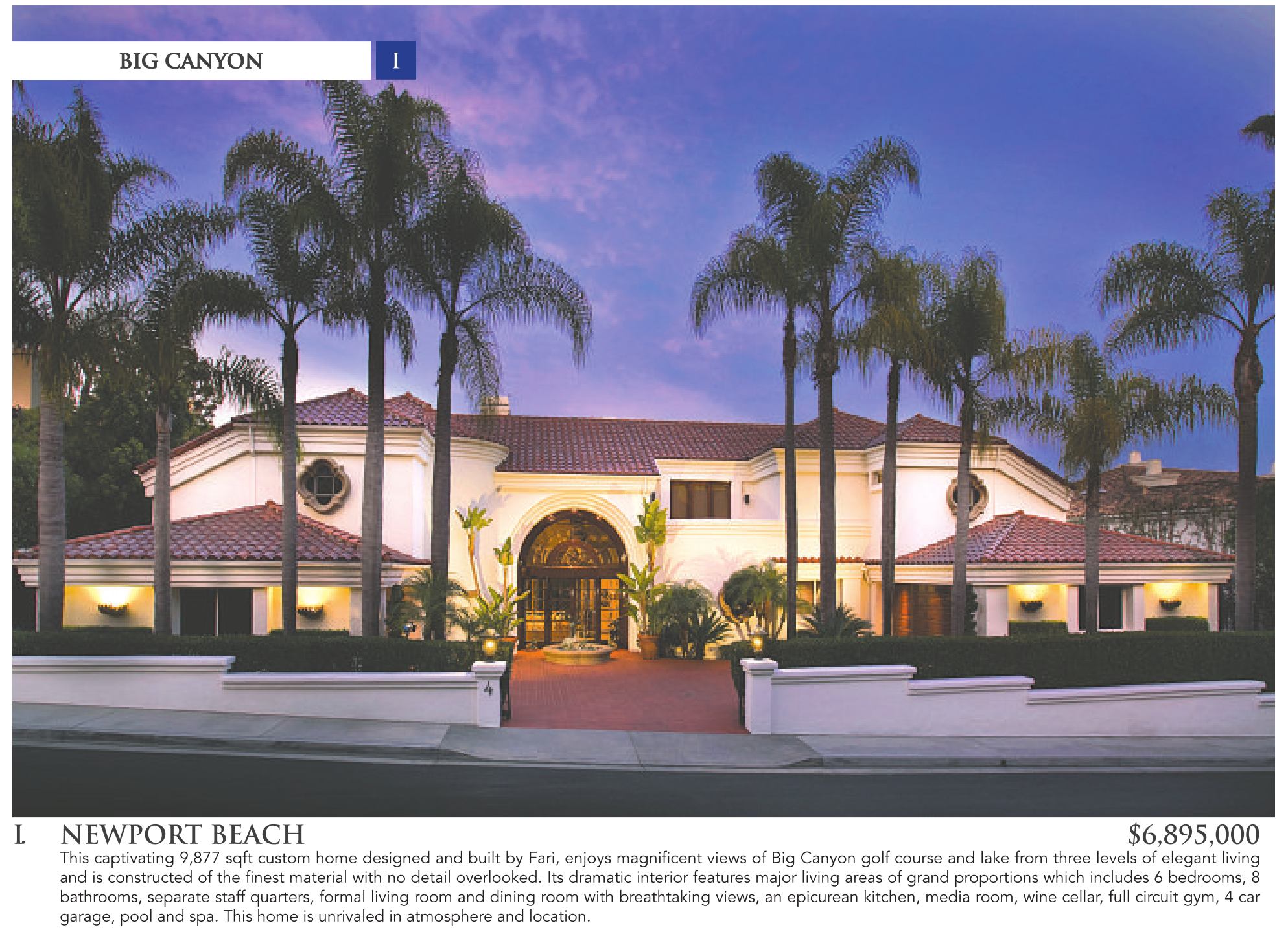 This captivating 9,877 sqft custom home designed and built by Fari, enjoys magnificent views of Big Canyon golf course and lake from three levels of elegant living