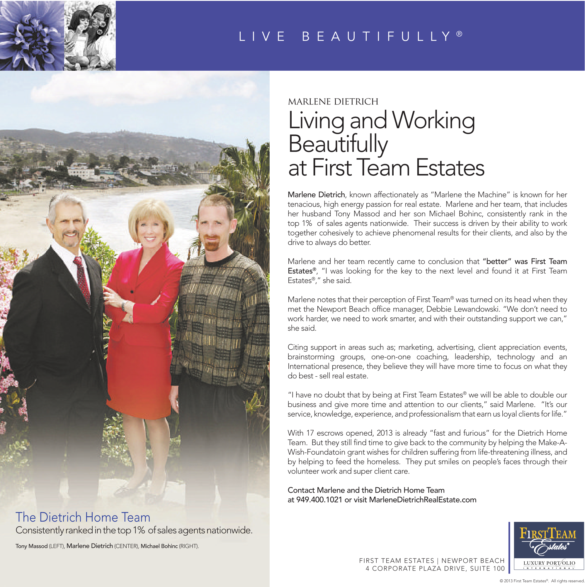 Marlene notes that their perception of First Team ® was turned on its head when they met the Newport Beach office manager, Debbie Lewandowski. “We don’t need to work harder, we need to work smarter, and with their outstanding support we can,” she said.