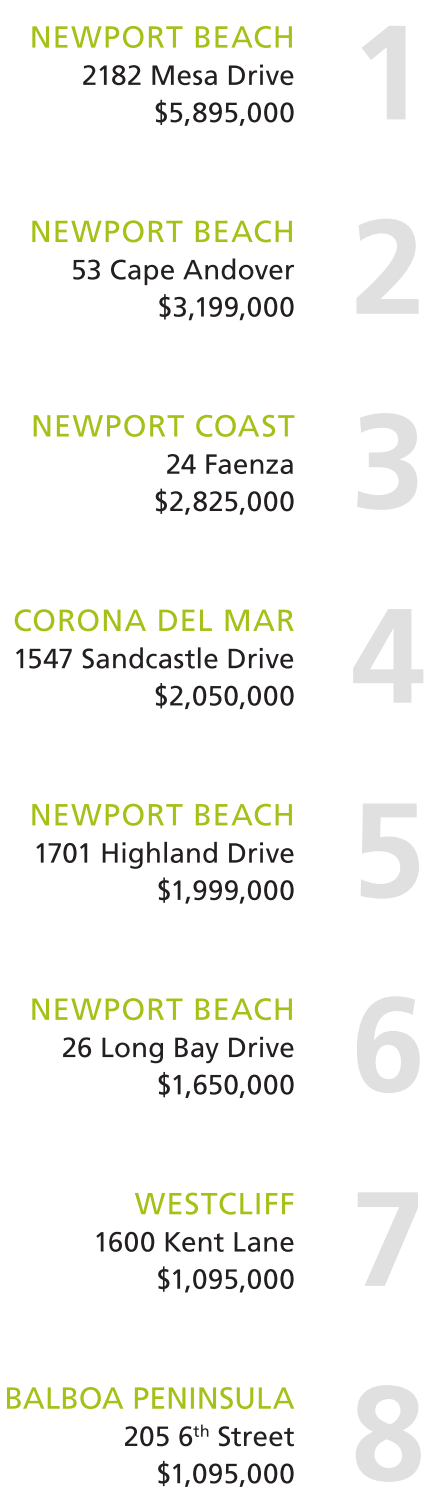 NEWPORT BEACH 2182 Mesa Drive $5,895,000 NEWPORT BEACH 53 Cape Andover $3,199,000 1 2 NEWPORT COAST 24 Faenza $2,825,000 3 CORONA DEL MAR 1547 Sandcastle Drive $2,050,000 4 NEWPORT BEACH 1701 Highland Drive $1,999,000 5 NEWPORT BEACH 26 Long Bay Drive $1,650,000 6 WESTCLIFF 1600 Kent Lane $1,095,000 7 BALBOA PENINSULA 205 6 th Street $1,095,000 8