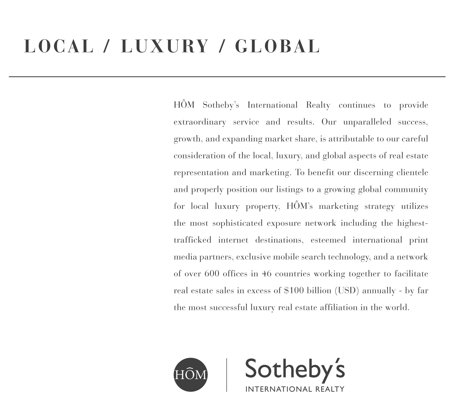 L O C A L / L U X U RY / G L O B A L HÔM Sotheby’s International Realty continues to provide extraordinary service and results. Our unparalleled success, growth, and expanding market share, is attributable to our careful consideration of the local, luxury, and global aspects of real estate representation and marketing. To benefit our discerning clientele and properly position our listings to a growing global community for local luxury property, HÔM’s marketing strategy utilizes the most sophisticated exposure network including the highesttrafficked internet destinations, esteemed international print media partners, exclusive mobile search technology, and a network of over 600 offices in 46 countries working together to facilitate real estate sales in excess of $100 billion (USD) annually - by far the most successful luxury real estate affiliation in the world.