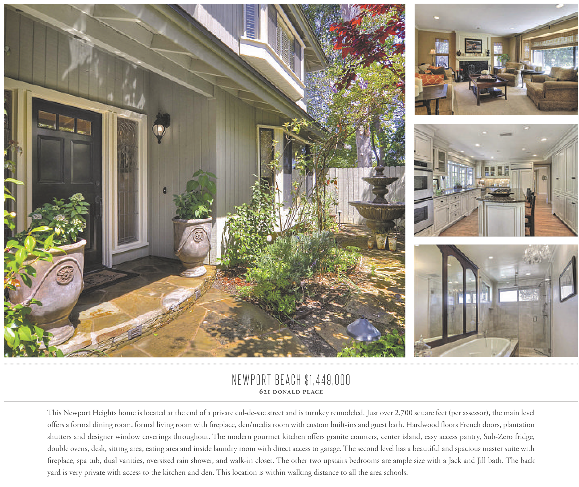 NEWPORT BEACH $1,449,000 621 donald place This Newport Heights home is located at the end of a private cul-de-sac street and is turnkey remodeled. Just over 2,700 square feet (per assessor), the main level offers a formal dining room, formal living room with fireplace, den/media room with custom built-ins and guest bath. Hardwood floors French doors, plantation shutters and designer window coverings throughout. The modern gourmet kitchen offers granite counters, center island, easy access pantry, Sub-Zero fridge, double ovens, desk, sitting area, eating area and inside laundry room with direct access to garage. The second level has a beautiful and spacious master suite with fireplace, spa tub, dual vanities, oversized rain shower, and walk-in closet. The other two upstairs bedrooms are ample size with a Jack and Jill bath. The back yard is very private with access to the kitchen and den. This location is within walking distance to all the area schools.