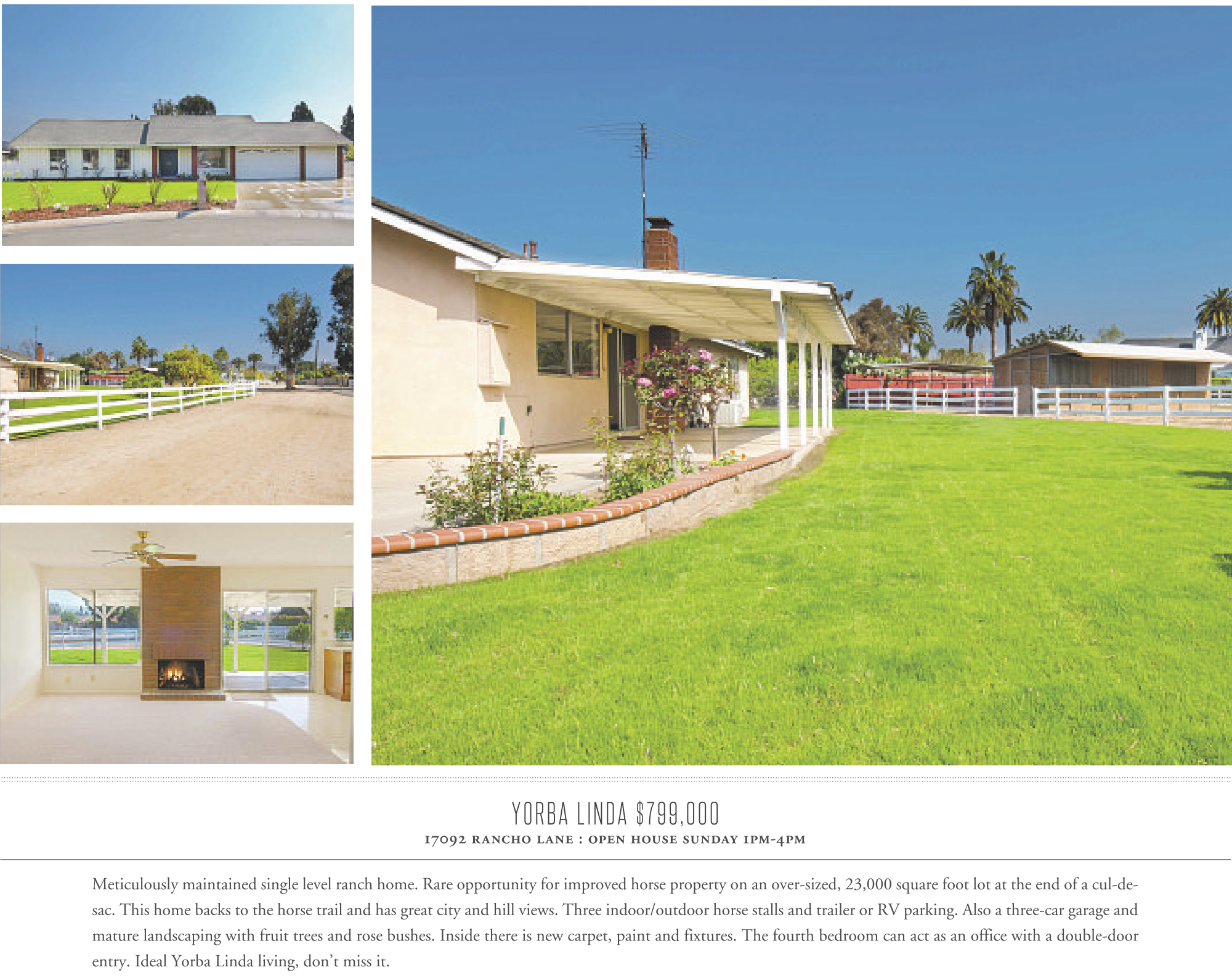 Meticulously maintained single level ranch home. Rare opportunity for improved horse property on an over-sized, 23,000 square foot lot at the end of a cul-desac. This home backs to the horse trail and has great city and hill views. Three indoor/outdoor horse stalls and trailer or RV parking. Also a three-car garage and mature landscaping with fruit trees and rose bushes. Inside there is new carpet, paint and fixtures. The fourth bedroom can act as an office with a double-door entry. Ideal Yorba Linda living, don’t miss it.