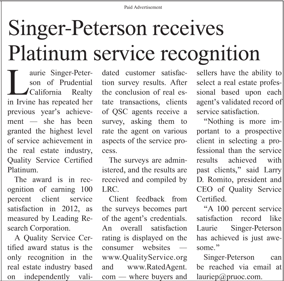 Paid Advertisement Singer-Peterson receives Platinum service recognition Laurie Singer-Peterson of Prudential California Realty in Irvine has repeated her previous year’s achievement — she has been granted the highest level of service achievement in the real estate industry, Quality Service Certified Platinum. The award is in recognition of earning 100 percent client service satisfaction in 2012, as measured by Leading Research Corporation. A Quality Service Certified award status is the only recognition in the real estate industry based on independently vali dated customer satisfaction survey results. After the conclusion of real estate transactions, clients of QSC agents receive a survey, asking them to rate the agent on various aspects of the service process. The surveys are administered, and the results are received and compiled by LRC. Client feedback from the surveys becomes part of the agent’s credentials. An overall satisfaction rating is displayed on the consumer websites — www.QualityService.org and www.RatedAgent. com — where buyers and sellers have the ability to select a real estate professional based upon each agent’s validated record of service satisfaction. “Nothing is more important to a prospective client in selecting a professional than the service results achieved with past clients,” said Larry D. Romito, president and CEO of Quality Service Certified. “A 100 percent service satisfaction record like Laurie Singer-Peterson has achieved is just awesome.” Singer-Peterson can be reached via email at lauriep@pruoc.com. See also