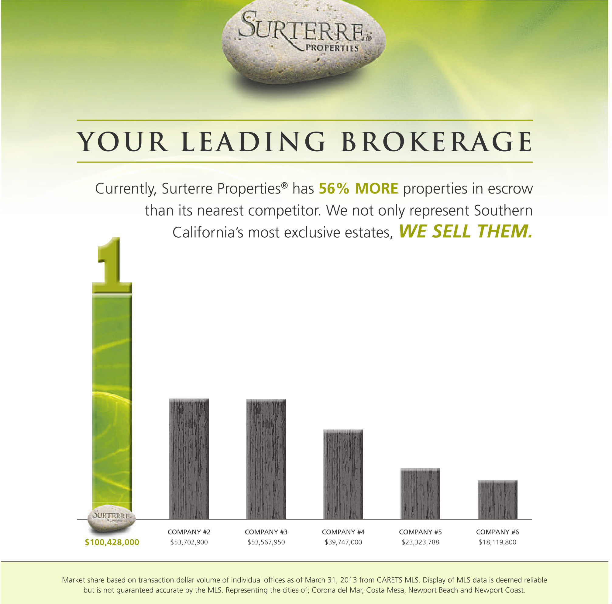Y O U R L E A D I N G B R O K E R A G E Currently, Surterre Properties ® has 56% MORE properties in escrow than its nearest competitor. We not only represent Southern California’s most exclusive estates, WE SELL THEM. $100,428,000 000 COMPANY #2 $53,702,900 COMPANY #3 $53,567,950 COMPANY #4 $39,747,000 COMPANY #5 $23,323,788 COMPANY #6 $18,119,800 Market share based on transaction dollar volume of individual offices as of March 31, 2013 from CARETS MLS. Display of MLS data is deemed reliable but is not guaranteed accurate by the MLS. Representing the cities of; Corona del Mar, Costa Mesa, Newport Beach and Newport Coast.