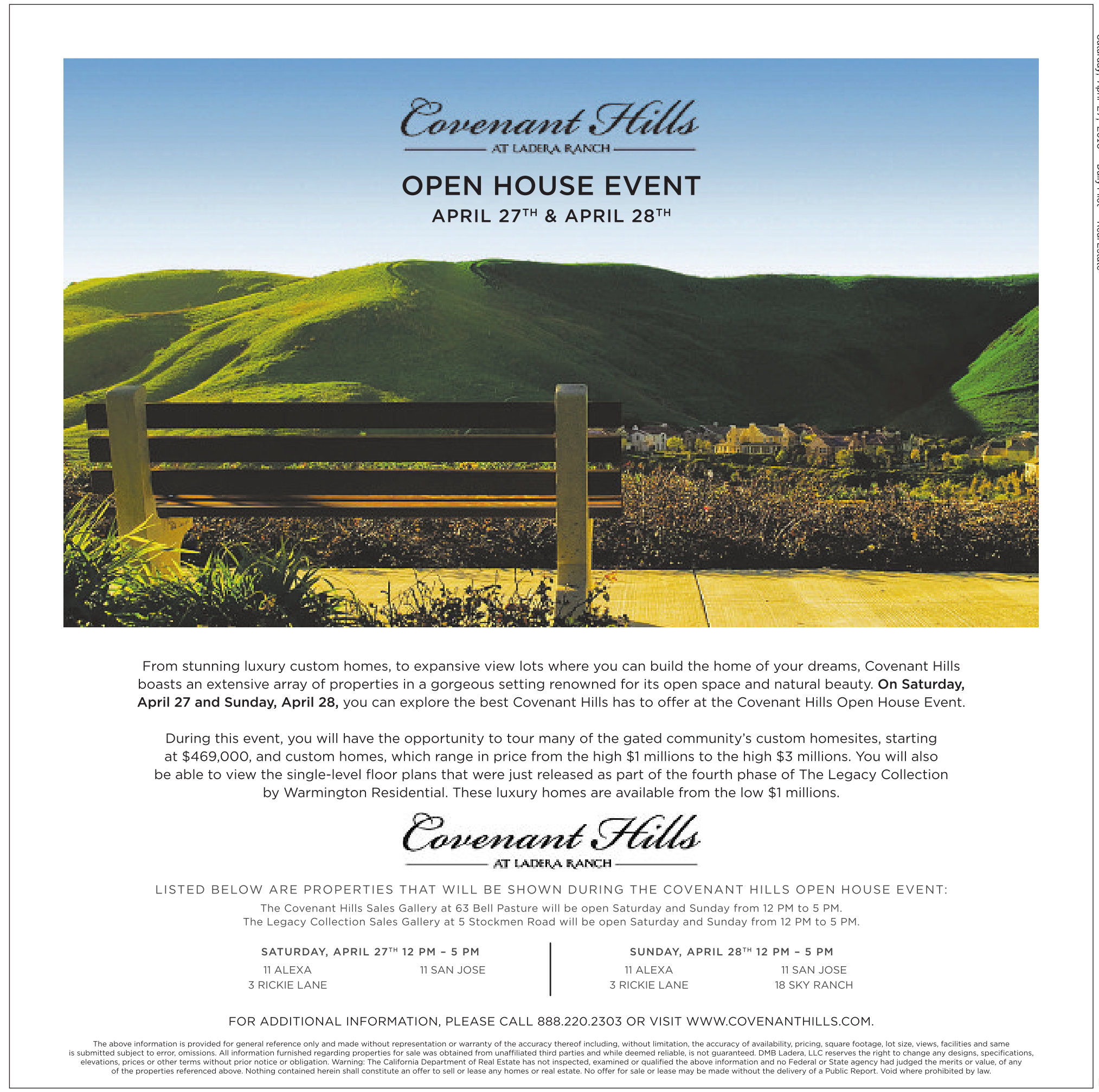 The above information is provided for general reference only and made without representation or warranty of the accuracy thereof including, without limitation, the accuracy of availability, pricing, square footage, lot size, views, facilities and same is submitted subject to error, omissions. All information furnished regarding properties for sale was obtained from unaffiliated third parties and while deemed reliable, isnot guaranteed. DMB Ladera, LLC reserves the right to change any designs, specifications, elevations, prices or other terms without prior notice orobligation. Warning: The California Department of Real Estate has not inspected, examined or qualified the above information and no Federal or State agency had judged the merits or value, ofany of the properties referenced above. Nothing contained herein shall constitute anoffer to sell or lease any homes or real estate. No offer for sale or lease may bemade without the delivery of aPublic Report. Void where prohibited by law.