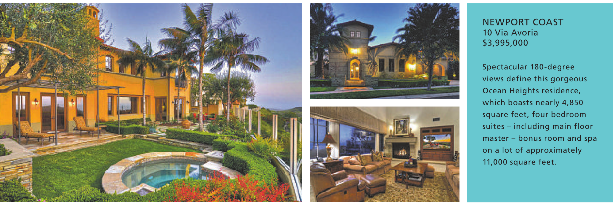 NEWPORT COAST 10 Via Avoria $3,995,000 Spectacular 180-degree views define this gorgeous Ocean Heights residence, which boasts nearly 4,850 square feet, four bedroom suites – including main floor master – bonus room and spa on a lot of approximately 11,000 square feet.