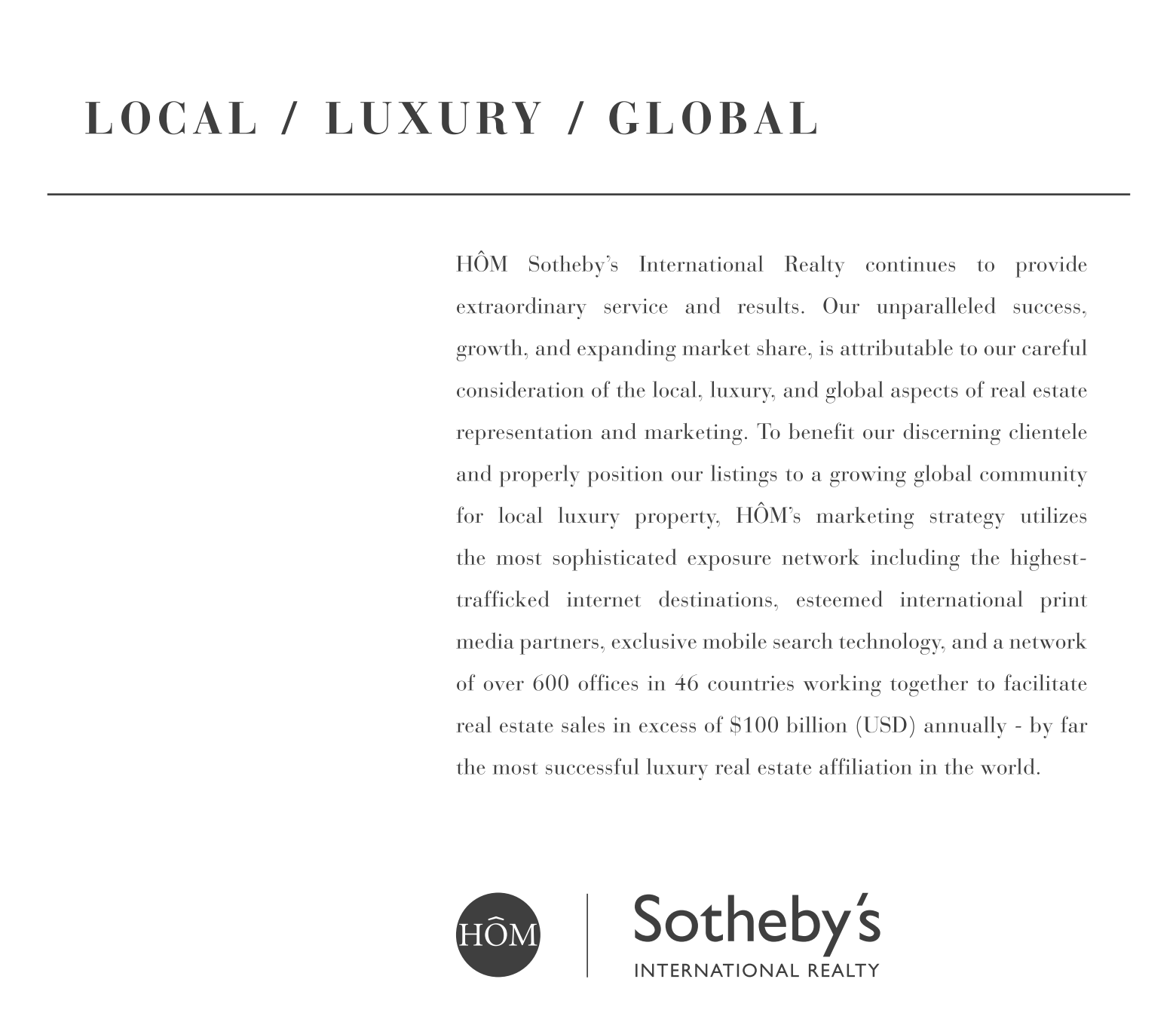 L O C A L / L U X U RY / G L O B A L HÔM Sotheby’s International Realty continues to provide extraordinary service and results. Our unparalleled success, growth, and expanding market share, is attributable to our careful consideration of the local, luxury, and global aspects of real estate representation and marketing. To benefit our discerning clientele and properly position our listings to a growing global community for local luxury property, HÔM’s marketing strategy utilizes the most sophisticated exposure network including the highesttrafficked internet destinations, esteemed international print media partners, exclusive mobile search technology, and a network of over 600 offices in 46 countries working together to facilitate real estate sales in excess of $100 billion (USD) annually - by far the most successful luxury real estate affiliation in the world.