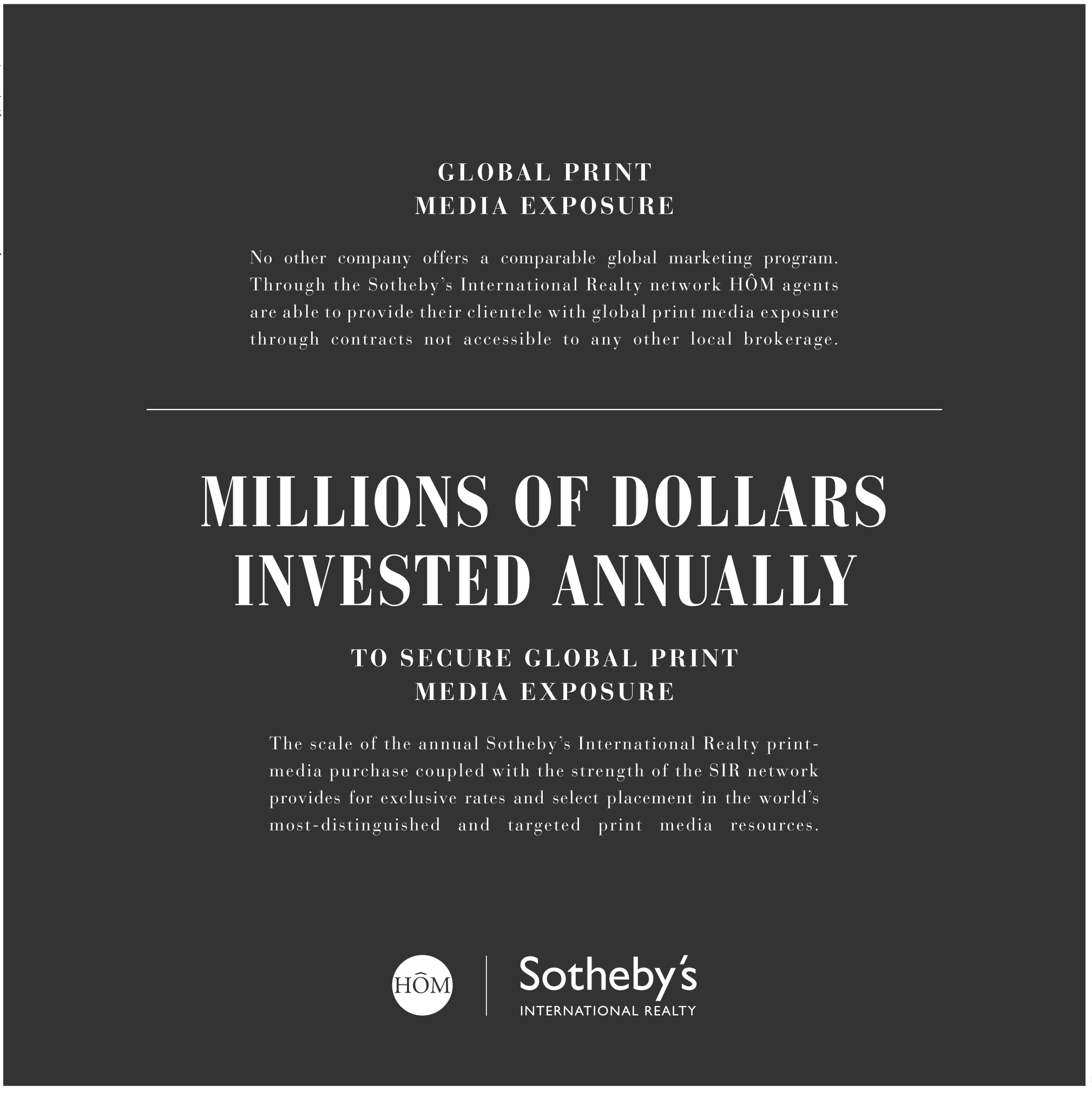 16 GLOBAL PRINT MEDIA EXPOSURE No other company offers a comparable global marketing program. Through the Sotheby’s International Realty network HÔM agents are able to provide their clientele with global print media exposure through contracts not accessible to any other local brokerage. MILLIONS OF DOLL A RS IN V ESTED A NNUA LLY TO SECURE GLOBAL PRINT MEDIA EXPOSURE The scale of the annual Sotheby’s International Realty printmedia purchase coupled with the strength of the SIR network provides for exclusive rates and select placement in the world’s most-distinguished and targeted print media resources.