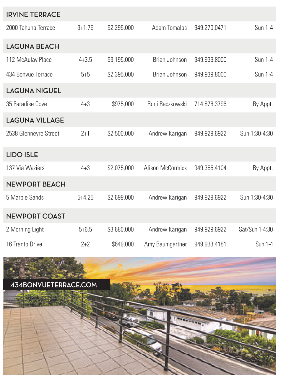 IRVINE TERRACE 2000 Tahuna Terrace 3+1.75 $2,295,000 Adam Tomalas 949.270.0471 Sun 1-4 GUNA BEACH 112 McAulay Place 4+3.5 $3,195,000 Brian Johnson 949.939.8000 Sun 1-4 434 Bonvue Terrace 5+5 $2,395,000 Brian Johnson 949.939.8000 Sun 1-4 GUNA NIGUEL 35 Paradise Cove 4+3 $975,000 Roni Raczkowski 714.878.3796 By Appt. GUNA VIL GE 2538 Glenneyre Street 2+1 $2,500,000 Andrew Karigan 949.929.6922 Sun 1:30-4:30 LIDO ISLE 137 ViaWaziers 4+3 $2,075,000 Alison McCormick 949.355.4104 By Appt. NEWPORTBEACH 5Marble Sands 5+4.25 $2,699,000 Andrew Karigan 949.929.6922 Sun 1:30-4:30 NEWPORTCOAST 2Morning Light 5+6.5 $3,680,000 Andrew Karigan 949.929.6922 Sat/Sun 1-4:30 16 Tranto Drive 2+2 $649,000 Amy Baumgartner 949.933.4181 Sun 1-4 434BONVUETERRACE.COM