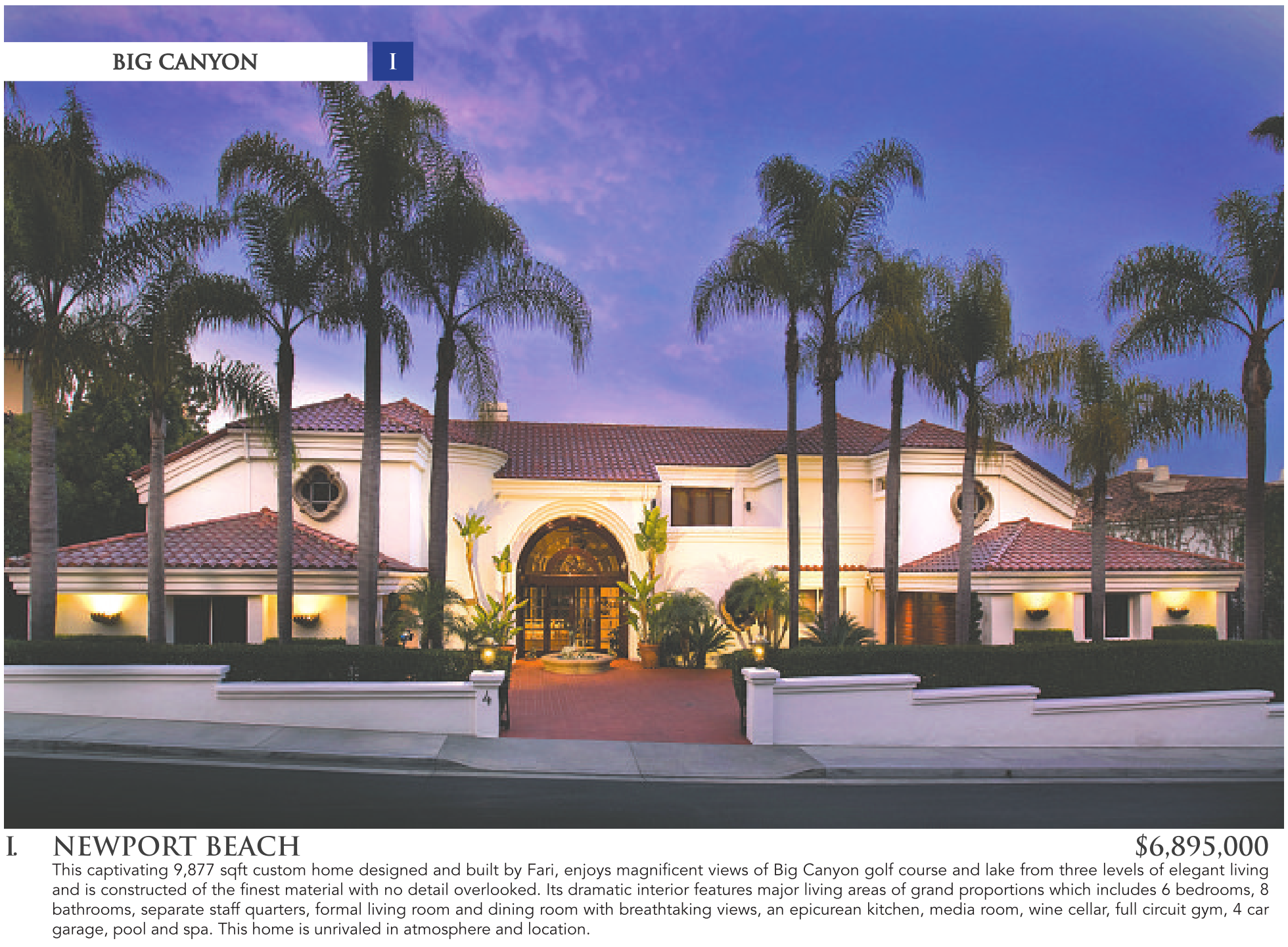 BIG CANYON BIG CANYON I I. NEWPORT BEACH $6,895,000 This captivating 9,877 sqft custom home designed and built by Fari, enjoys magnificent views of Big Canyon golf course and lake from three levels of elegant living and is constructed of the finest material with no detail overlooked. Its dramatic interior features major living areas of grand proportions which includes 6 bedrooms, 8bathrooms, separate staff quarters, formal living room and dining room with breathtaking views, an epicurean kitchen, media room, wine cellar, full circuit gym, 4 car garage, pool and spa. This home is unrivaled in atmosphere and location.
