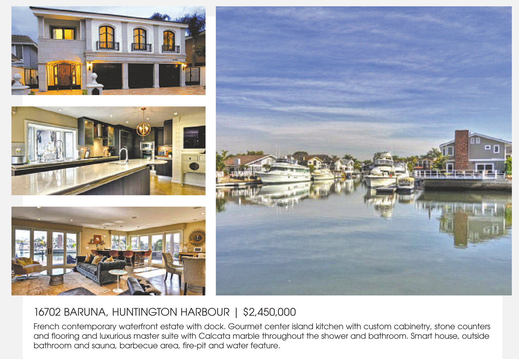 16702 BARUNA, HUNTINGTON HARBOUR | $2,450,000 French contemporary waterfront estate with dock. Gourmet center island kitchen with custom cabinetry, stone counters and flooring and luxurious master suite with Calcata marble throughout the shower and bathroom. Smart house, outside bathroom and sauna, barbecue area, fire-pit and water feature.