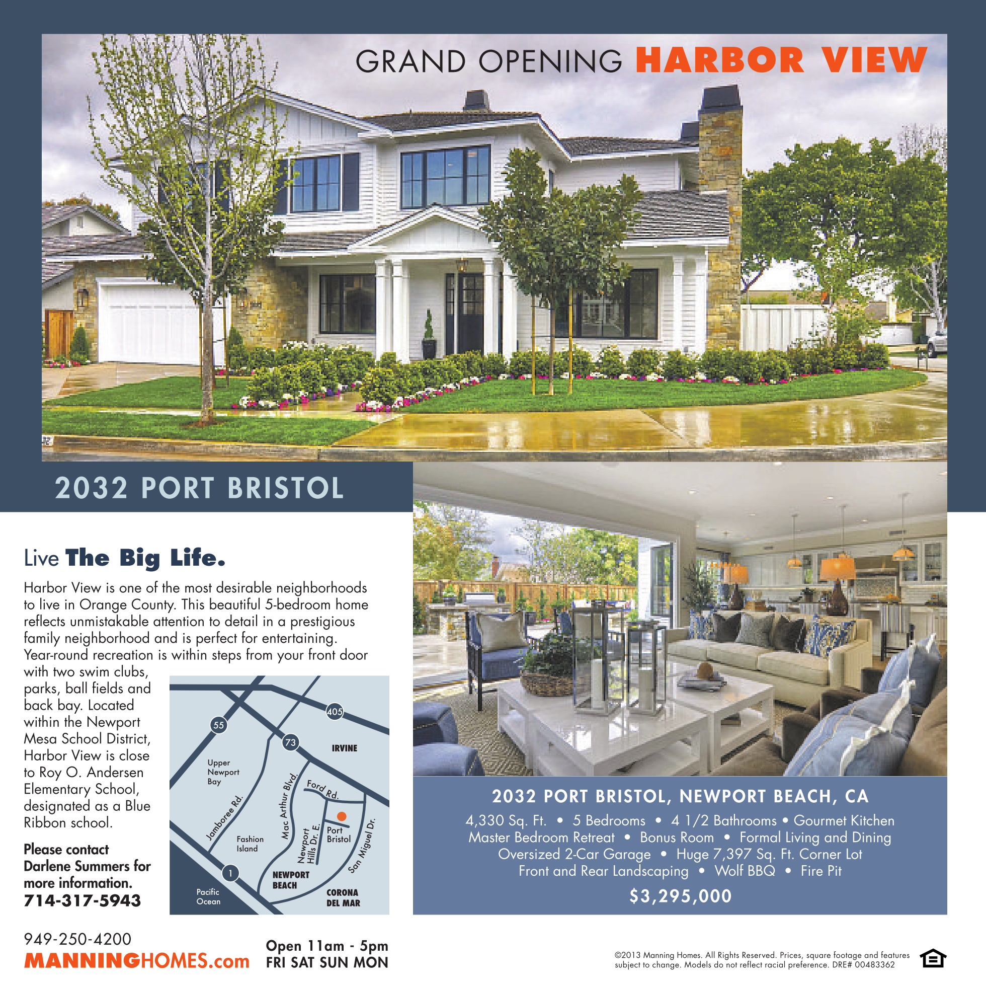 GRAND OPENING HARBOR VIEW 2 0 3 2 P O RT B RISTOL Live The Big Life. Harbor View is one of the most desirable neighborhoods to live in Orange County. This beautiful 5-bedroom home reflects unmistakable attention to detail in a prestigious family neighborhood and is perfect for entertaining. Year-round recreation is within steps from your front door with two swim clubs, parks, ball fields and back bay. Located within the Newport Mesa School District, Harbor View is close to Roy O. Andersen Elementary School, designated as a Blue Ribbon school. Please contact Darlene Summers for more information. 714-317-5943 2032 PORT BRISTOL, NEWPORT BEACH, CA 4,330 Sq. Ft. • 5 Bedrooms • 4 1/2 Bathrooms • Gourmet Kitchen Master Bedroom Retreat • Bonus Room • Formal Living and Dining Oversized 2-Car Garage • Huge 7,397 Sq. Ft. Corner Lot Front and Rear Landscaping • Wolf BBQ • Fire Pit $3,295,000 949-250-4200 MANNINGHOMES.com Open 11am - 5pm FRI SAT SUN MON ©2013 Manning Homes. All Rights Reserved. Prices, square footage and features subject tochange. Models donot reflect racial preference. DRE# 00483362