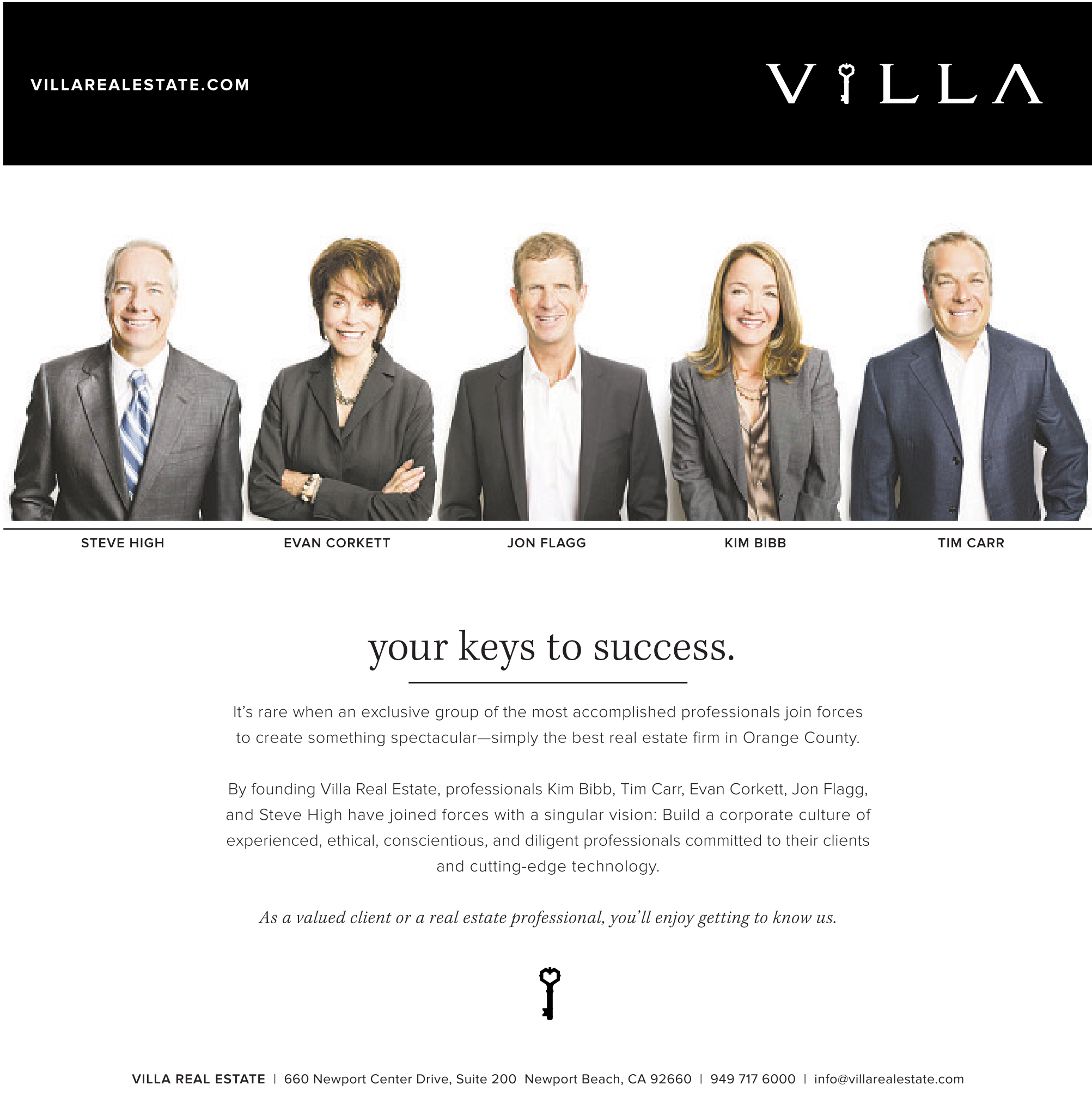 VILLAREALESTATE.COM STEVE HIGH EVAN CORKETT JON FLAGG KIM BIBB TIM CARR your keys to success. It’s rare when an exclusive group of the most accomplished professionals join forces to create something spectacular—simply the best real estate firm in Orange County. By founding Villa Real Estate, professionals Kim Bibb, Tim Carr, Evan Corkett, Jon Flagg, and Steve High have joined forces with a singular vision: Build a corporate culture of experienced, ethical, conscientious, and diligent professionals committed to their clients and cutting-edge technology. As a valued client or a real estate professional, you’ ll enjoy getting to know us. VILLA REAL ESTATE | 660 Newport Center Drive, Suite 200 Newport Beach, CA 92660 | 949 717 6000 | info@villarealestate.com