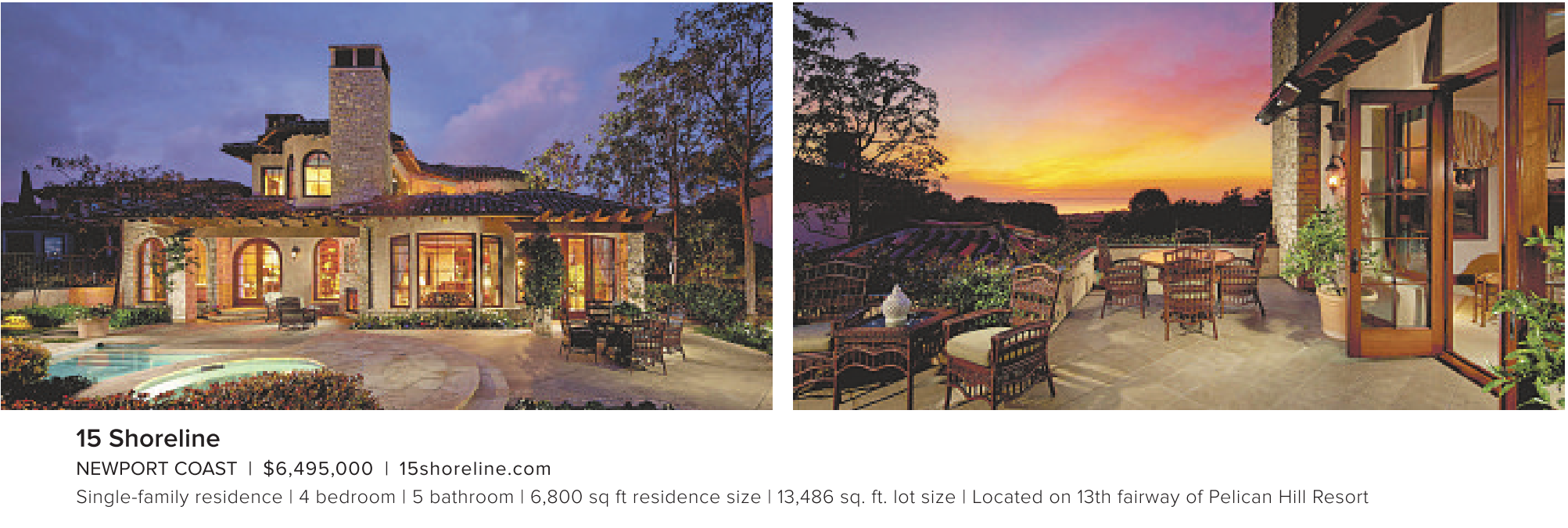 NEWPORT COAST | $6,495,000 | 15shoreline.com Single-family residence | 4 bedroom | 5 bathroom | 6,800 sq ft residence size | 13,486 sq. ft. lot size | Located on 13th fairway of Pelican Hill Resort