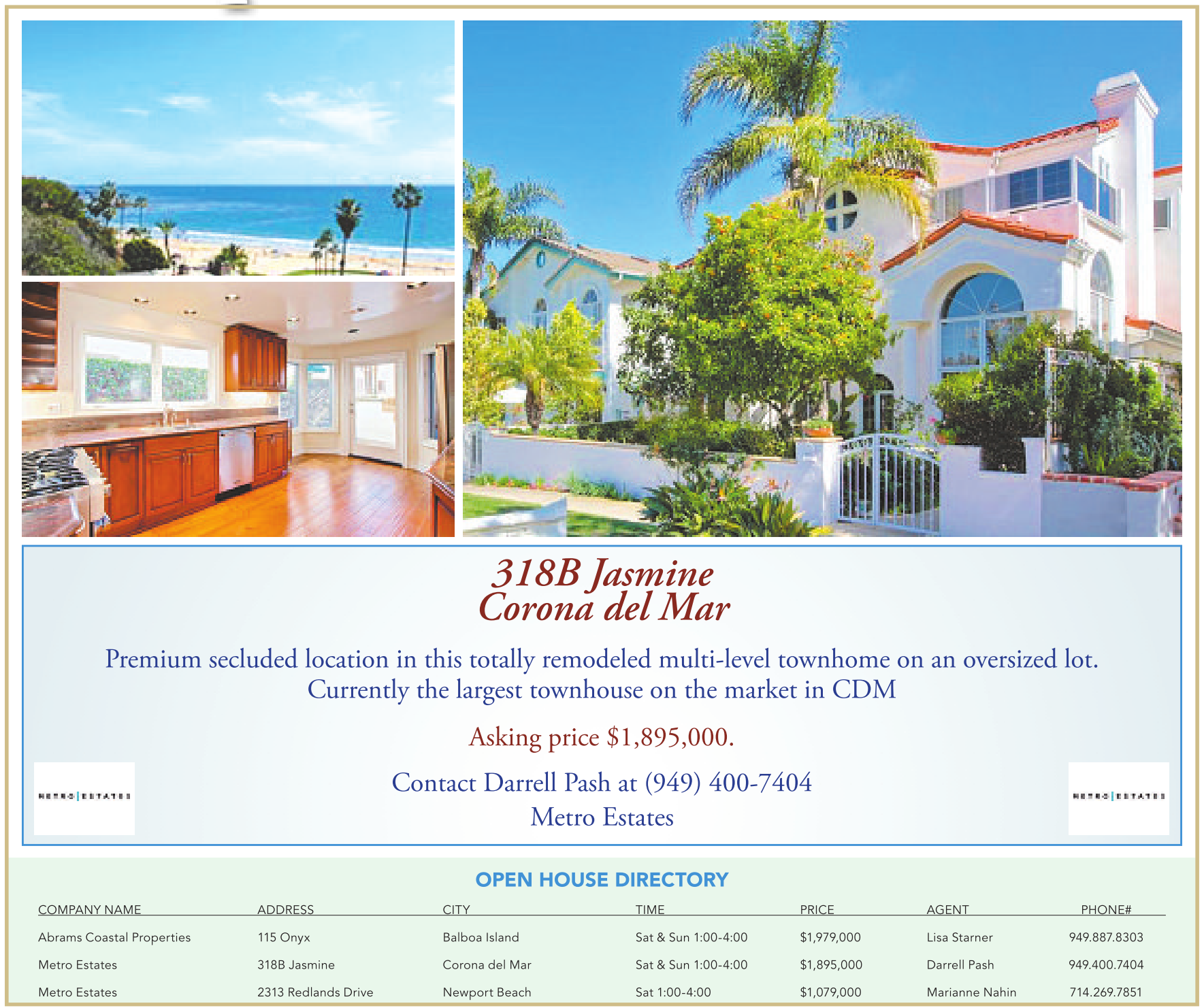 318B Jasmine Corona del Mar Premium secluded location in this totally remodeled multi-level townhome on an oversized lot. Currently the largest townhouse on the market in CDM Asking price $1,895,000. Contact Darrell Pash at (949) 400-7404 Metro Estates OPEN HOUSE DIRECTORY COMPANY NAME ADDRESS CITY TIME PRICE AGENT PHONE# Abrams Coastal Properties 115 Onyx Balboa Island Sat &Sun 1:00-4:00 $1,979,000 Lisa Starner 949.887.8303 Metro Estates 318B Jasmine Corona del Mar Sat &Sun 1:00-4:00 $1,895,000 Darrell Pash 949.400.7404 Metro Estates 2313 Redlands Drive Newport Beach Sat 1:00-4:00 $1,079,000 Marianne Nahin 714.269.7851
