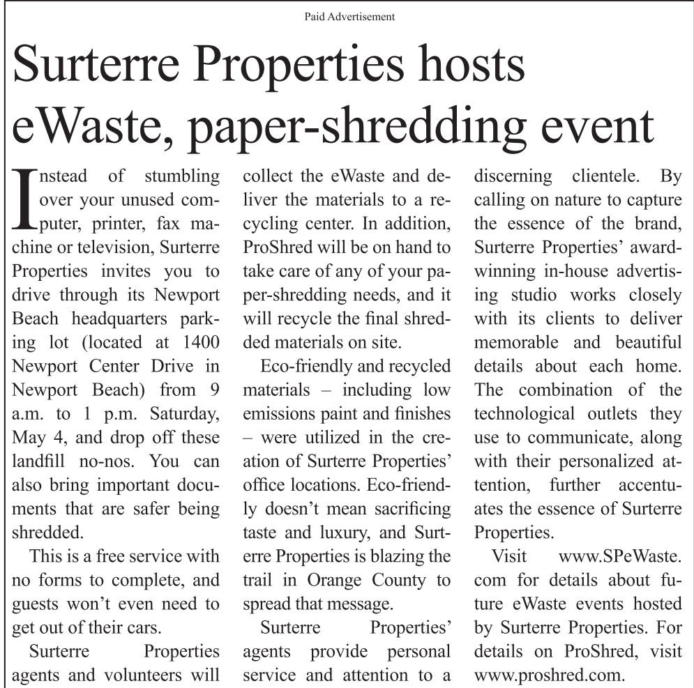 of stumbling over your unused computer, printer, fax machine or television, Surterre Properties invites you to drive through its Newport Beach headquarters parking lot (located at 1400 Newport Center Drive in Newport Beach) from 9 a.m. to 1 p.m. Saturday, May 4, and drop off these landfill no-nos. You can also bring important documents that are safer being shredded.